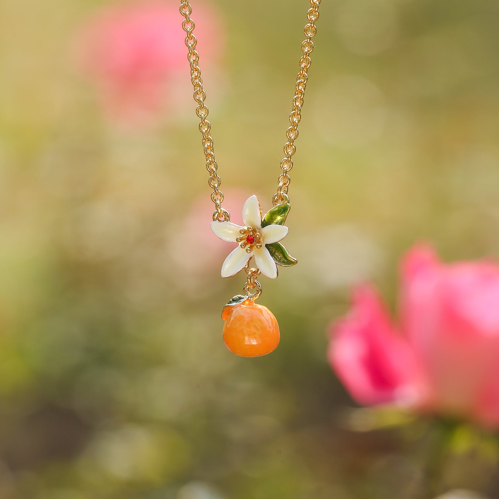 Orange blossom and orange meet in this fine orange necklace, helping women add a minimalist yet flowery touch to their daily outfits. Enamelled workmanship, ensuring the vividness of the flower and the orange, gives this necklace so much life and sweetness. Every woman deserves to have this wonderful orange necklace.