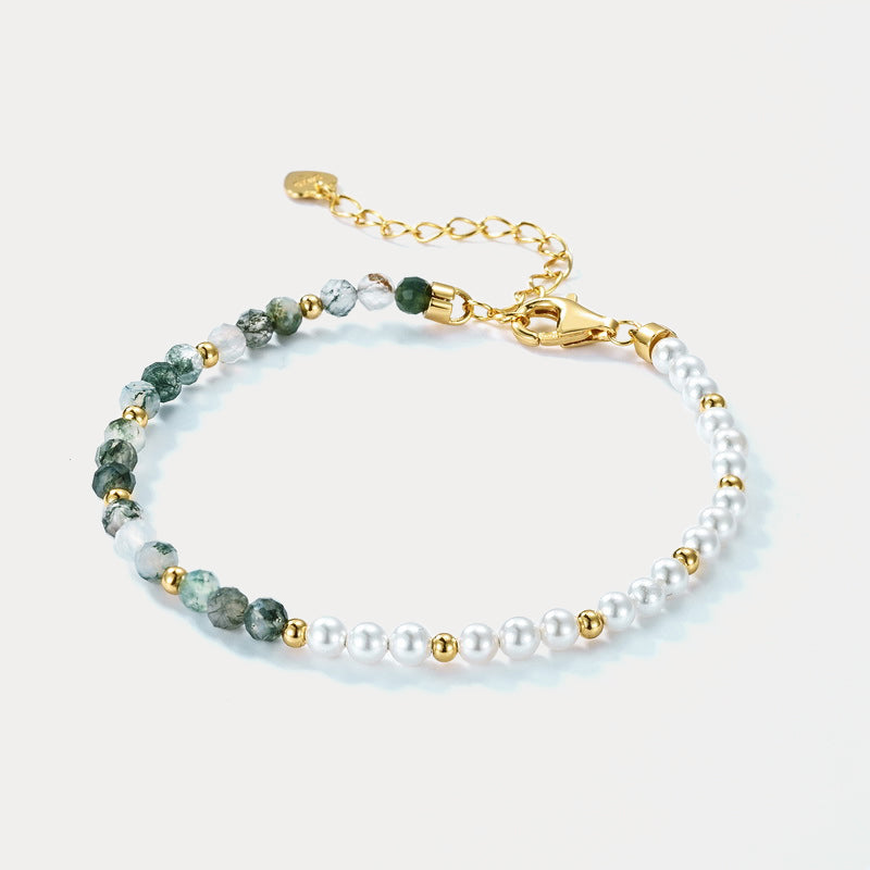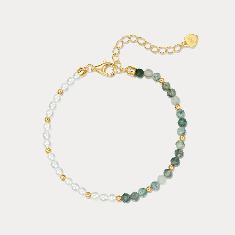 Embrace the serene beauty of nature with our Moss Green Stone Pearl Bracelet! The bracelet showcases alternating pearls and moss green stones, creating a balanced and visually appealing design. The pearls, with their smooth, radiant luster, symbolize purity and grace, while the moss green stones, known for their intricate patterns and calming hues, evoke the serene beauty of a forest floor. Wearing this Moss Green Stone Pearl Bracelet will elevate your style, imbuing it with an air of refined sophistication and natural beauty.