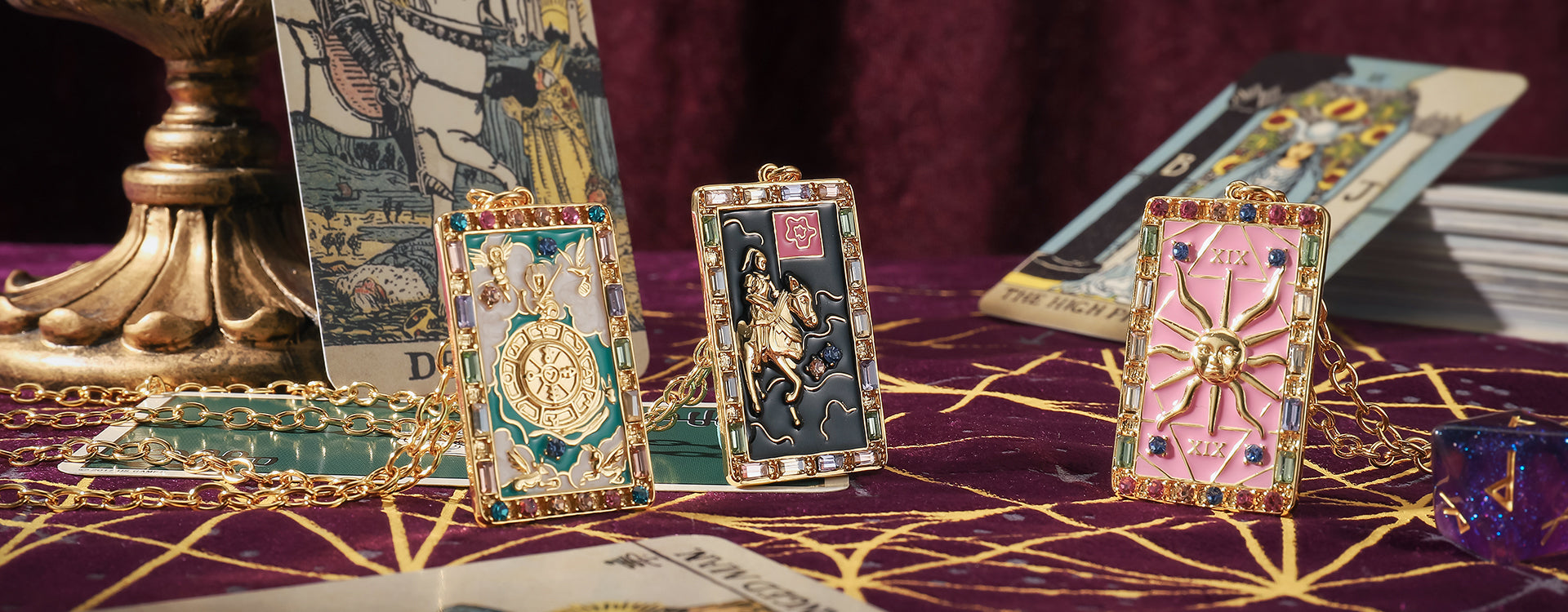Entdecken Sie unsere Tarot -Karten -Halskettensammlung mit Emaille Artismanship. Jedes Stück ist akribisch mit spiritueller Bedeutung gefertigt, die von der Tarotkarte inspiriert ist. Schicksalsrad repräsentiert Veränderung und Schicksal, der Mond bedeutet Geheimnis und Sonne symbolisierte Positivität. Wir tragen Tarotanhänger als Talisman oder Schutz. Meah, aber sie können auch als bedeutungsvolles Geschenk für unsere geliebten dienen.