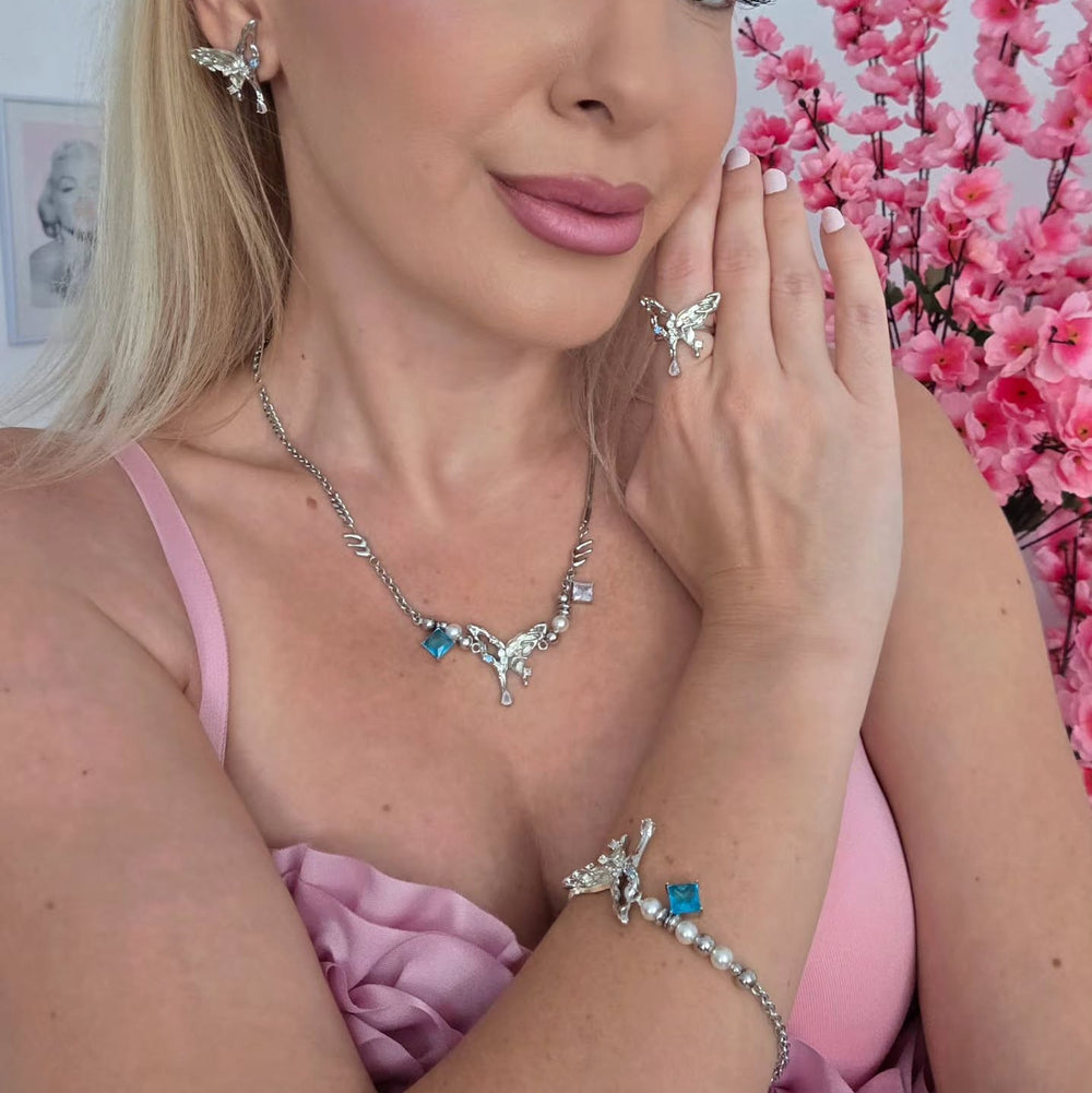 Die "schmelzenden Aurora -Schmetterlingsohrringe" sind eine atemberaubende Symphonie von Charme und Phantasie. Diese Ohrringe wurden mit komplizierten Details entworfen und erfassen die zarte Schönheit flatternder Schmetterlinge inmitten eines schmelzenden Aurora borealis. Mit babyblauen Diamanten geschmückt und aus glänzendem Palladium gestaltet, verkörpern sie die Essenz von Y2K und Balletcore -Ästhetik. Perfekt, um Ihrer Garderobe einen Farbtupfer und Spaß zu verleihen. (Außerdem werden sie nicht schmelzen, wir versprechen!)