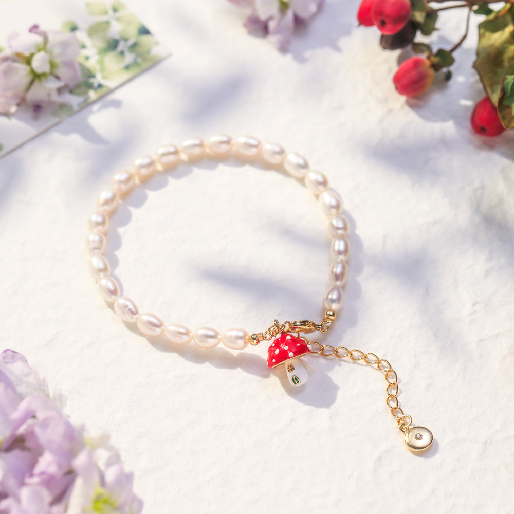 Blend classic elegance with a touch of fairy-tale whimsy in this mushroom bracelet, combining smooth pearls with playful mushroom designs. Featuring the red-capped white-spotted motif and delicate details, it creates a unique and refined wrist statement that stands out in any jewelry collection. Versatile enough to complement various styles, the mushroom charm bracelet fits perfectly with both simple, polished office looks and elegant evening gatherings. Wearing this Mushroom Pearl Bracelet not only elevates your outfit but also showcases your distinctive taste for unique design and fresh inspiration, making it a captivating piece that sparks conversation and highlights refined aesthetics.