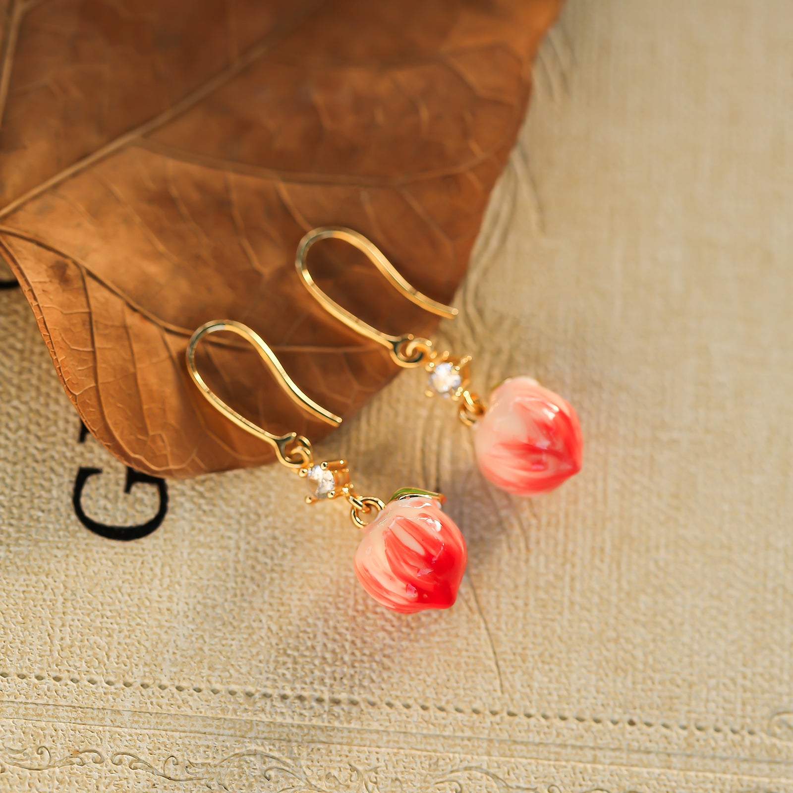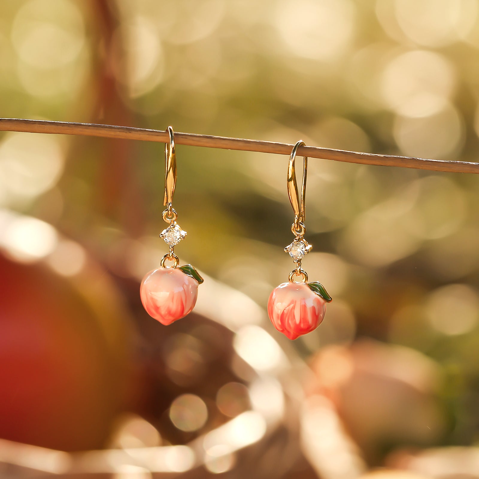 Erleben Sie die Magie der Natur mit unseren Pfirsichohrringen. Diese schönen Ohrringe mit einem zarten, emaillierten Pfirsich, der mit funkelnden Kubikzirkonien geschmückt ist, verleihen jedem Stil einen Hauch von Glamour. Sie werden die Süße und den Jubel des Sommers genießen, den sie Ihnen bringen. Umfassen Sie Ihre Liebe zum Obstschmuck mit diesen atemberaubenden Ohrringen!