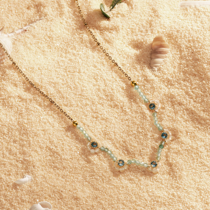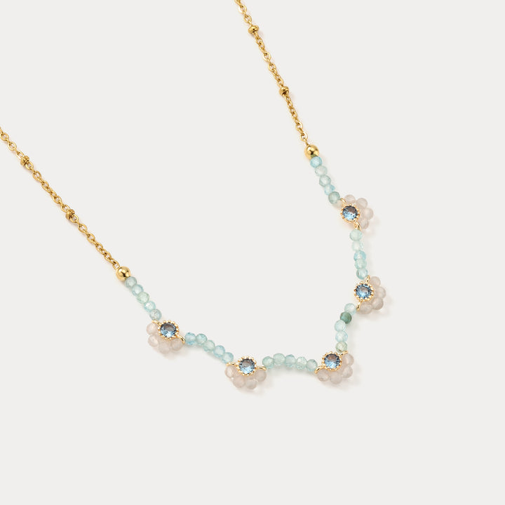 A Aquamarine Blume Perlen Halskette. Dieses exquisite Stück, das auf einem langlebigen aufgestiegen ist Stahlketteist eine Kaskade von Aquamarinperlen Das spiegelt den klaren Sommerhimmel wider. Unter ihnen sind zarte Blüten aus Hand hergestellt Weiße Jade, symbolisieren Reinheit und Ruhe. Die Mitte jedes Blooms funkelt mit Kubikzirkonieerinnert an Dewdrops in der Morgensonne. Diese Sommer -Blumenkette ist nicht nur ein Accessoire. Es ist eine Feier des Verjüngungsgeistes des Sommers, perfekt für diejenigen, die die Wärme der Saison das ganze Jahr über in das Herz tragen. Elegant und doch verspielt, es ist eine vielseitige Ergänzung zu jeder Schmuckkollektion.