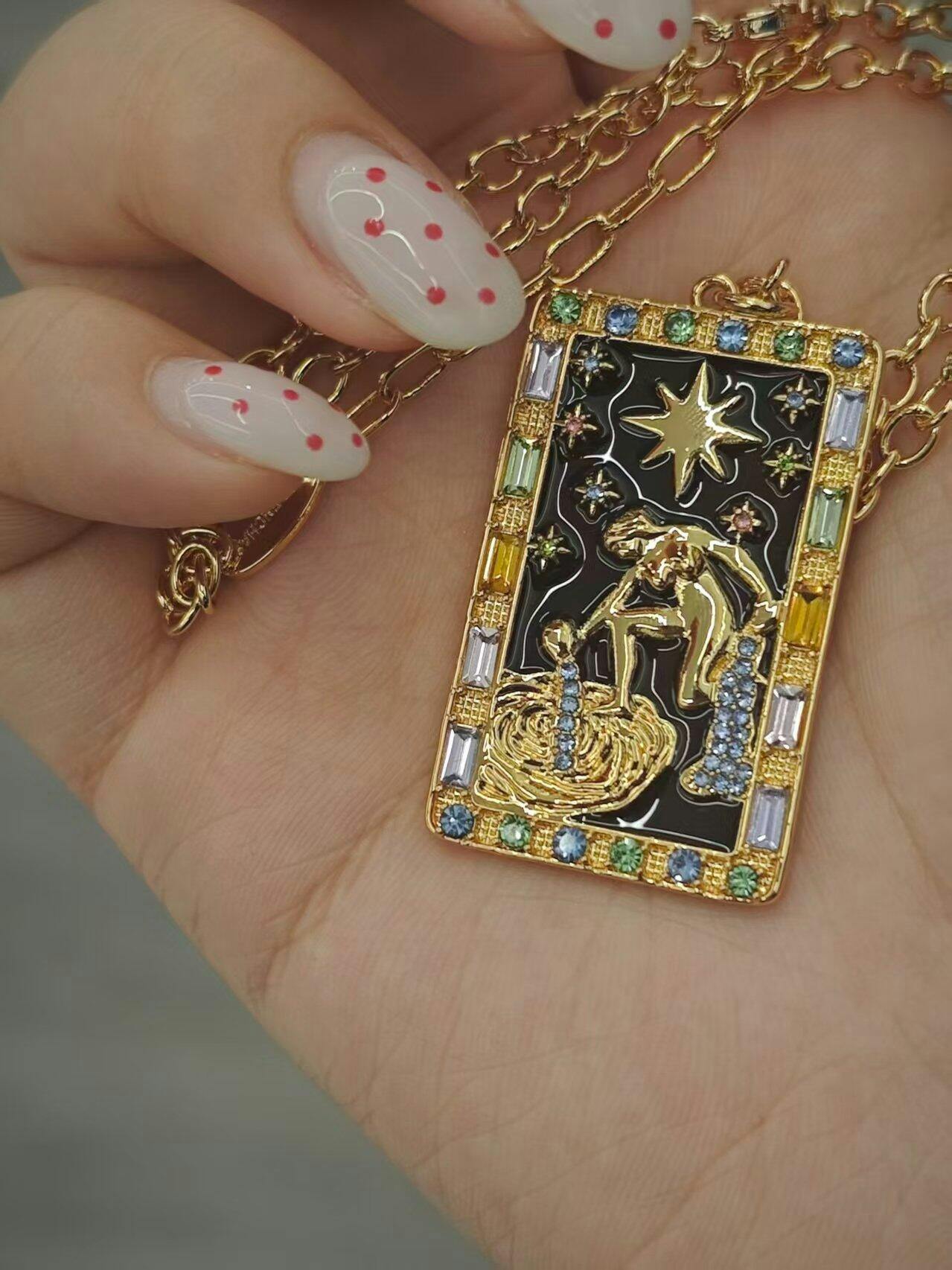 Lift your look to the stars with The Star Tarot Necklace, crafted with beautiful brass enamel, perfect for that special someone in your life! Show off your passion for astrology with this modern piece of jewelry that fuses classic style and modern flair. Whether for yourself or a loved one, give the gift of good luck with The Star Tarot Necklace.