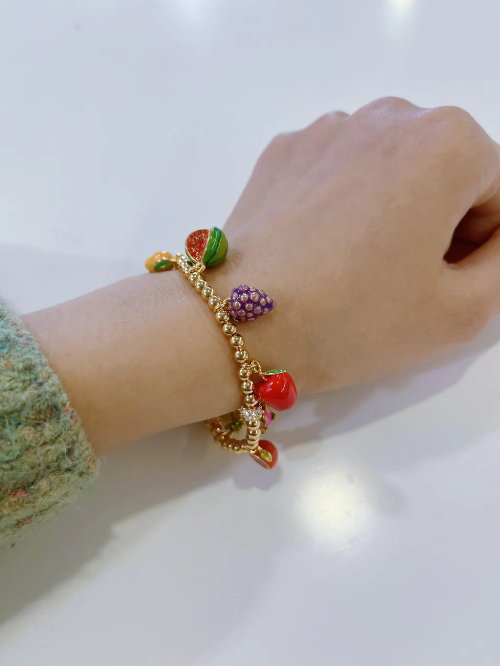 Fall in love with the fruit jewellery trend with this costume jewellery bracelet, Fruit Basket Enamel Bracelet, from our Nature Jewelry. This bracelet inspired by fruits grown in all seasons, including cherry, orange, strawberry, mango, watermelon, grape, apple, dragon fruit, pomegranate and pineapple, displaying a fruitful orchard and delivering energy and hope. Rich colors help enlighten your skin and complement your outfits. In addition, you can keep or remove some fruit pendants according to your preferences and requirements. >>See More Fruit Jewelry Collection.