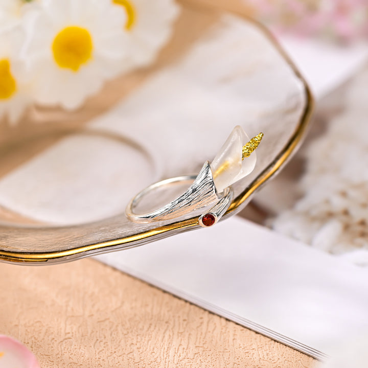 Experience the delicate beauty of the Silver Calla Lily Ring. Crafted with precision and care, this stunning ring features intricate calla lily details in shiny silver. Embrace the elegance of nature with this unique piece and add a touch of grace to any outfit.