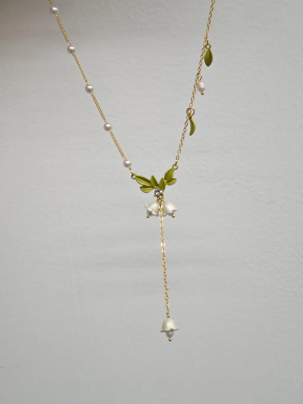 This necklace is so soft and romantic. The little lily of the valley blooms look gentle and elegant, and the Y-shape makes it even more graceful.