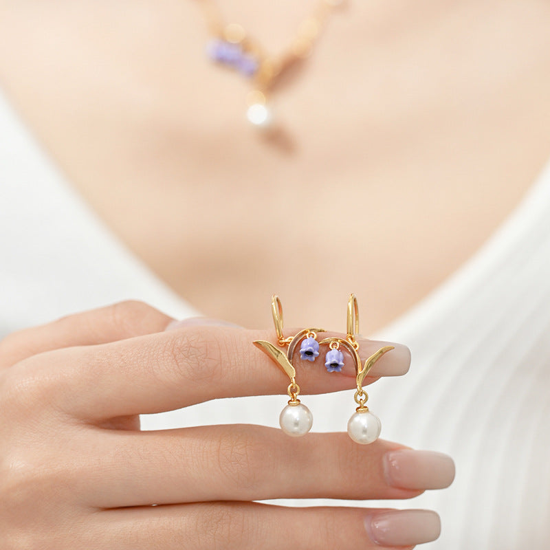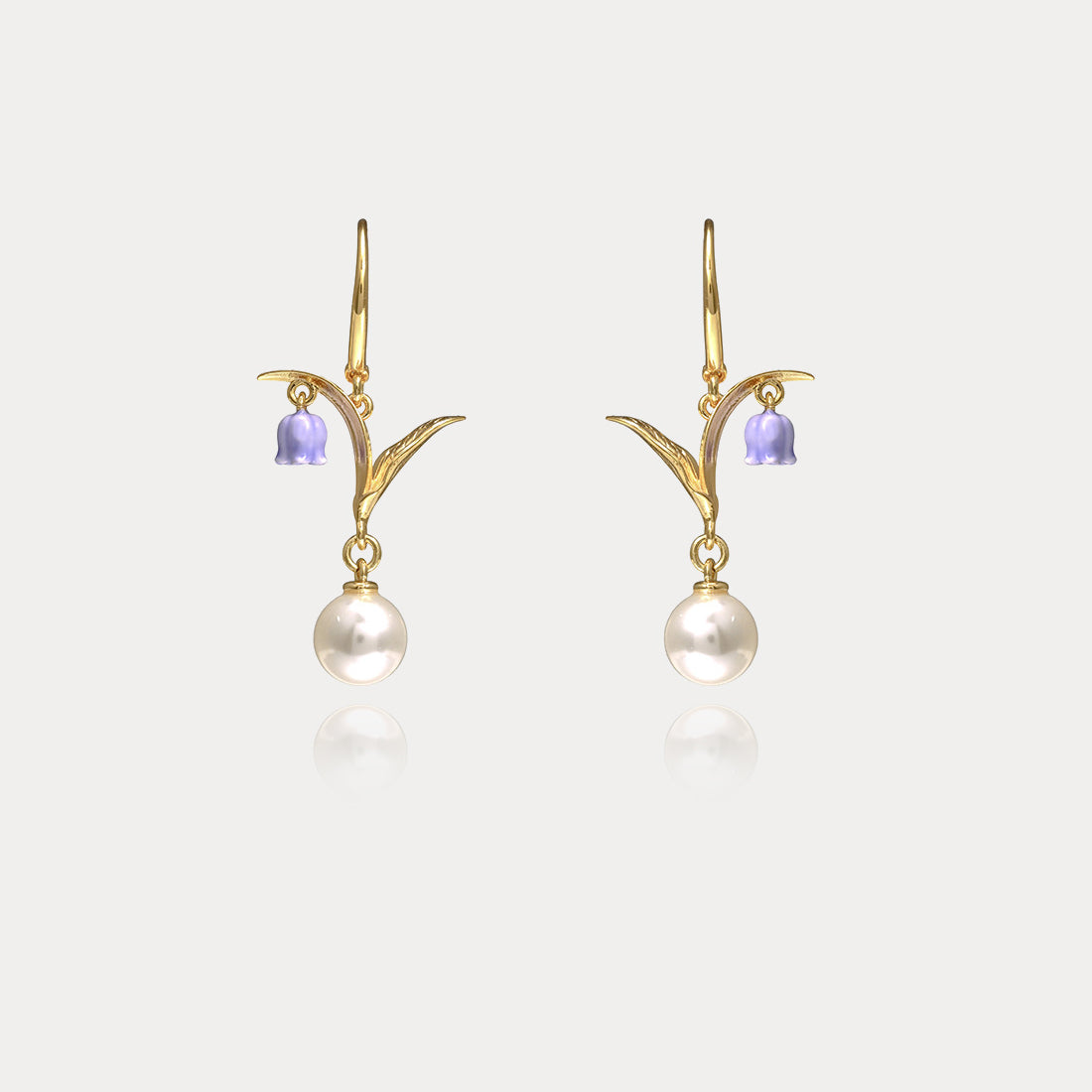 Lily of the valley blossoms take shape in delicate enamel, paired with luminous pearls that move gently with every step. The floral silhouette captures the spirit of spring jewelry while keeping the design refined enough for everyday wear. Pearl jewelry lovers will appreciate the soft contrast between glossy enamel petals and the natural glow of freshwater pearls. A graceful gift for her, perfect for bridal jewelry styling or romantic garden-inspired looks.