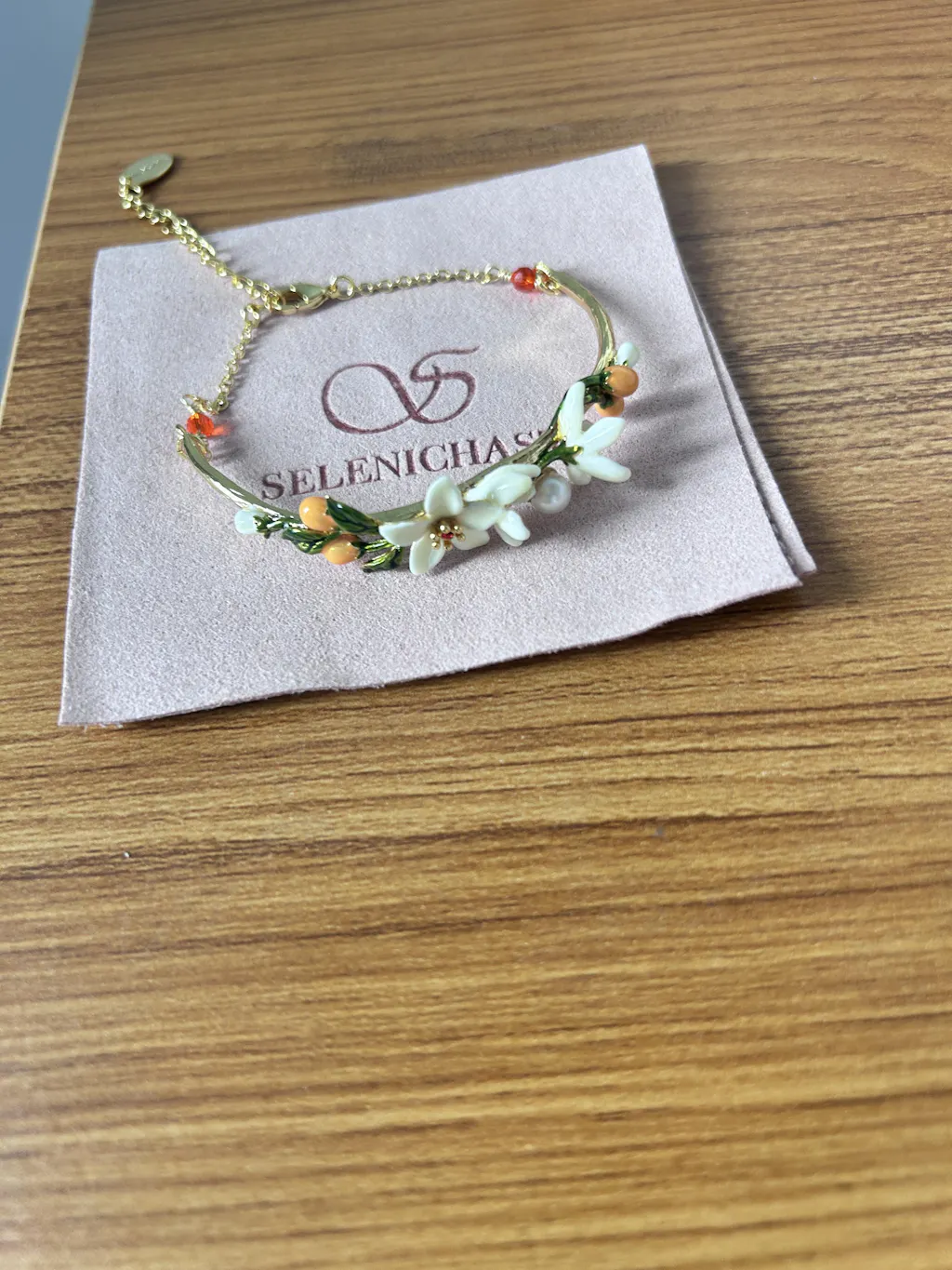 Our Orange Blossom Bracelet is a truly enchanting accessory, exquisite in its detail and craftsmanship. Crafted with brass and enamel, this charming piece exudes a dreamy cottagecore aesthetic that is sure to bewitch the onlooker. An effortless way to add a dash of elegance to any outfit, this bracelet is an undeniable statement of luxury and refinement. Orange Blossom Bracelet is a unique bracelet among nature jewelry on Selenichast online shop. It’s pretty and charming on the wraist. Its enamel paint combined with a 18k gold chain looks so elegant.