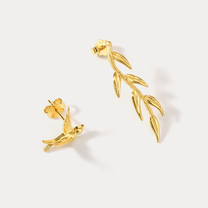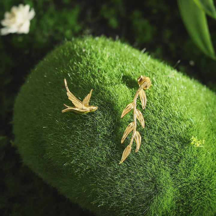 925 Sterling Silver Gold Swallow & Willow Mismatch Earrings