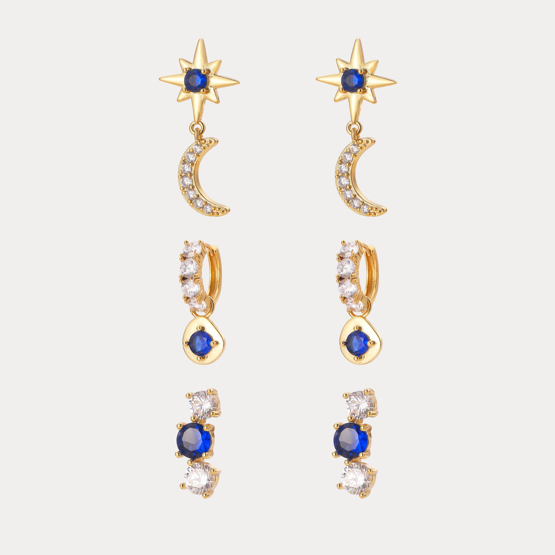 The Moon and Star Earring Sets include three pairs of earrings featuring brilliant white and deep blue cubic zirconia in the shapes of stars and moons, offering a sparkling yet refined look. Stars symbolize hope and brilliance, while the moon represents serenity and protection, creating a romantic and mystical vibe when combined. Perfect for everyday wear, date nights, festive gatherings, or as a heartfelt gift for someone special, this set enhances elegance and charm, ensuring the wearer shines on any occasion.