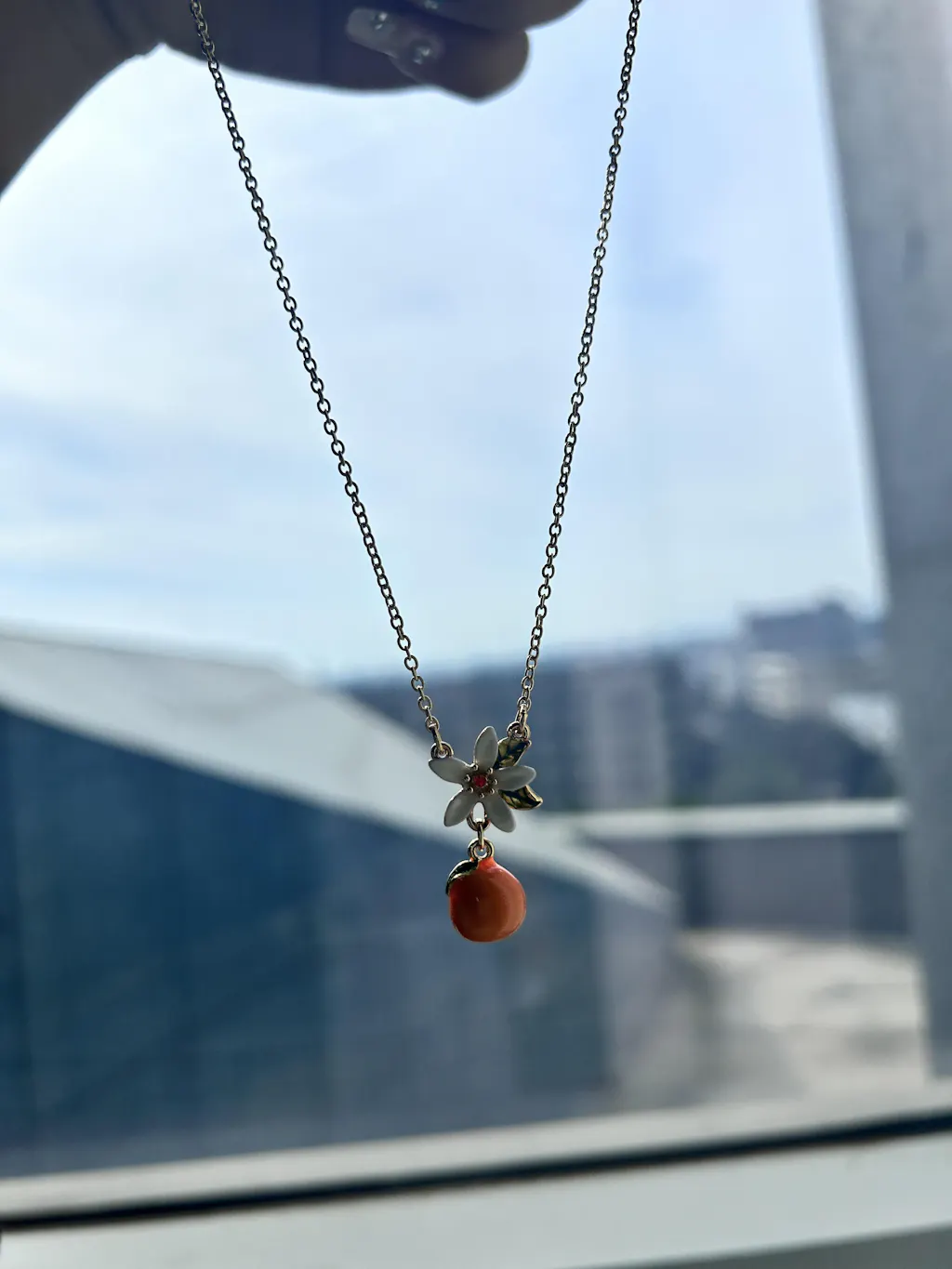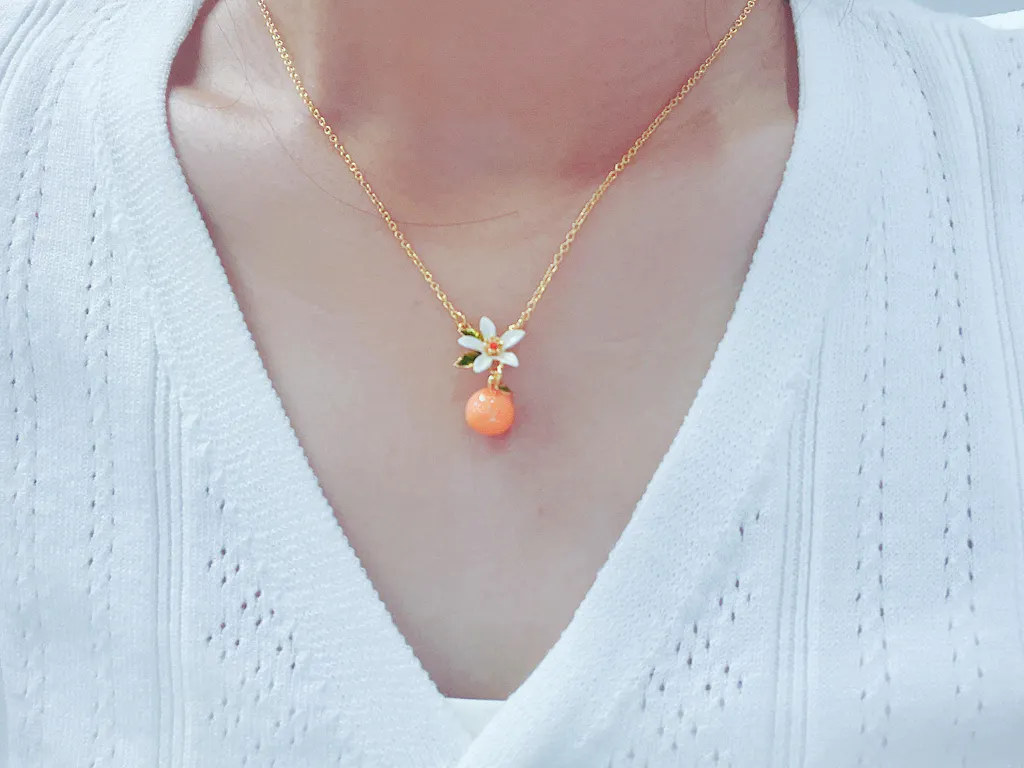 Orange blossom and orange meet in this fine orange necklace, helping women add a minimalist yet flowery touch to their daily outfits. Enamelled workmanship, ensuring the vividness of the flower and the orange, gives this necklace so much life and sweetness. Every woman deserves to have this wonderful orange necklace.