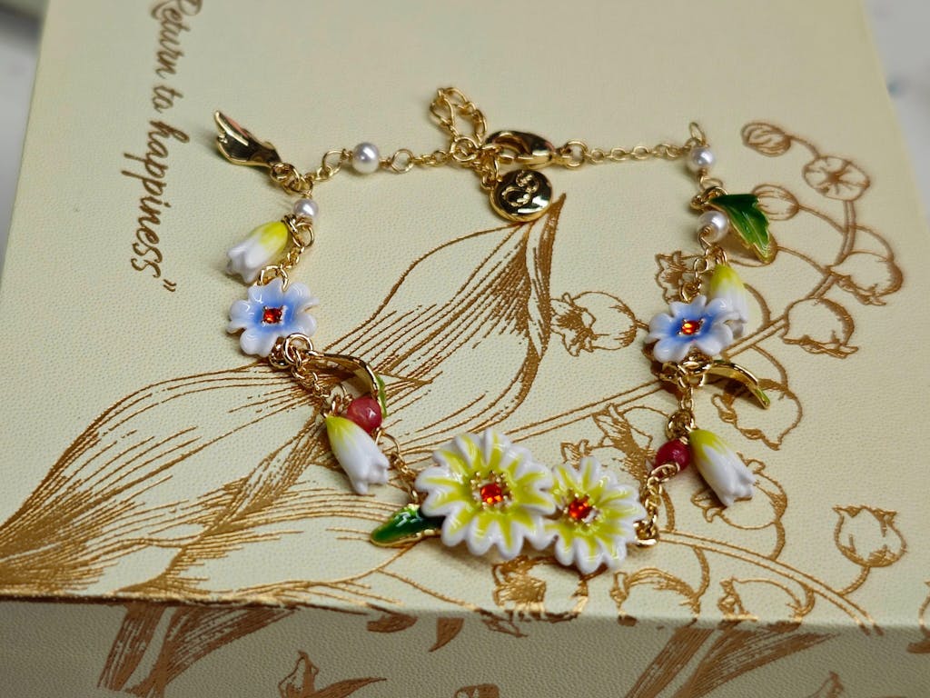 Little daisies dance gently along the chain, blooming one by one with a soft, cheerful glow. This Daisy Charms Bracelet features glossy enamel daisy charms in bright yellow and white, creating a fresh floral bracelet look that feels light and full of life. Each enamel flower charm adds a playful sparkle, making this daisy charm bracelet easy to layer or wear on its own. Sweet, lively, and full of spring energy, it’s a charming piece that brings a touch of sunshine to everyday jewelry styling.