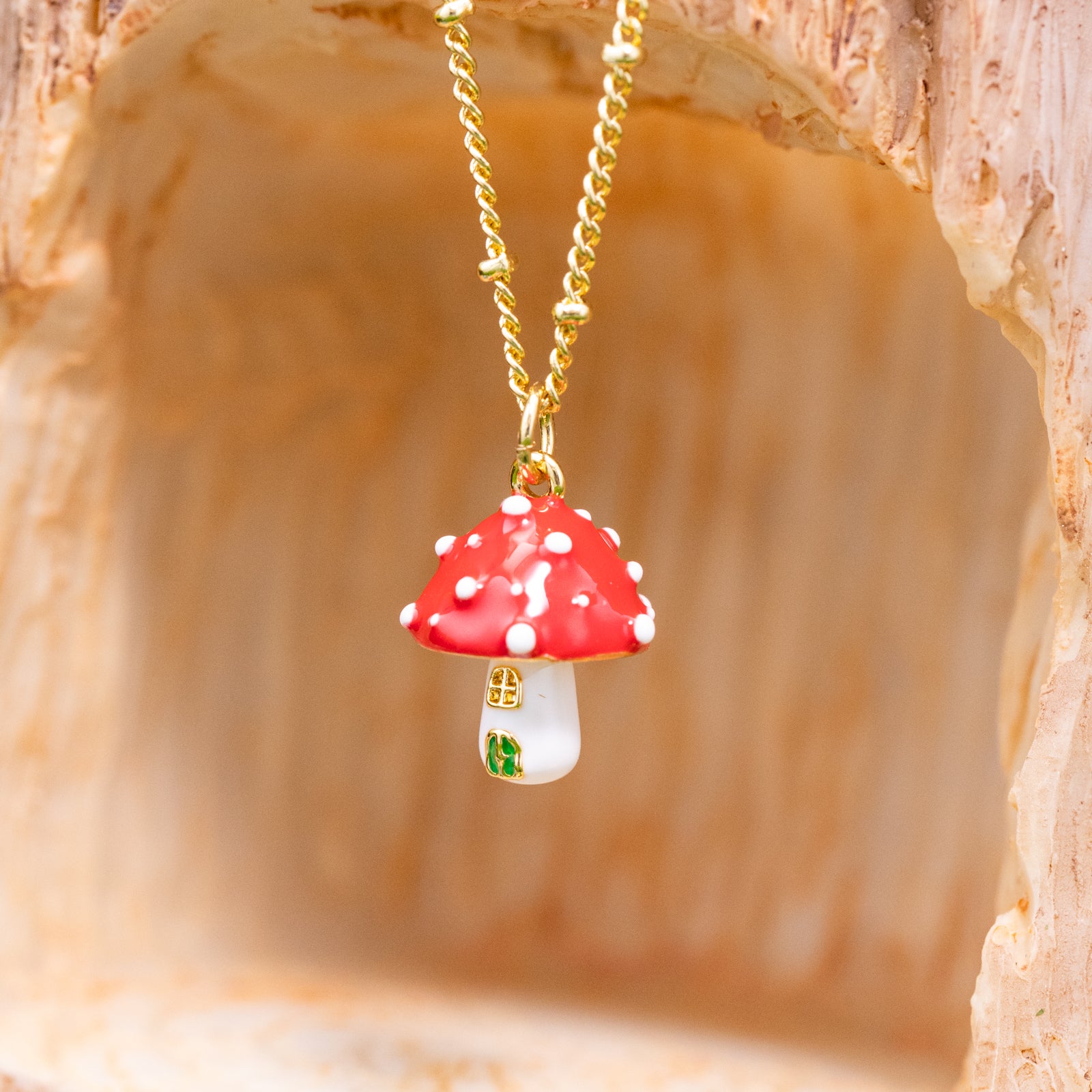 Add a touch of fairy-tale charm with this Mushroom Necklace. The red-capped white-spotted mushroom pendant shines with vibrant enamel and hangs on a delicate gold bead chain. This gold mushroom necklace symbolizes new beginnings and hope, carrying your best wishes wherever you go. Perfect for everyday wear, the necklace mushroom adds a playful detail to work outfits and pairs beautifully with dresses for a romantic touch. Whether you want to refresh your style or find a unique accessory, this mushroom pendant necklace combines meaningful symbolism with a distinctive design to effortlessly enhance your look.