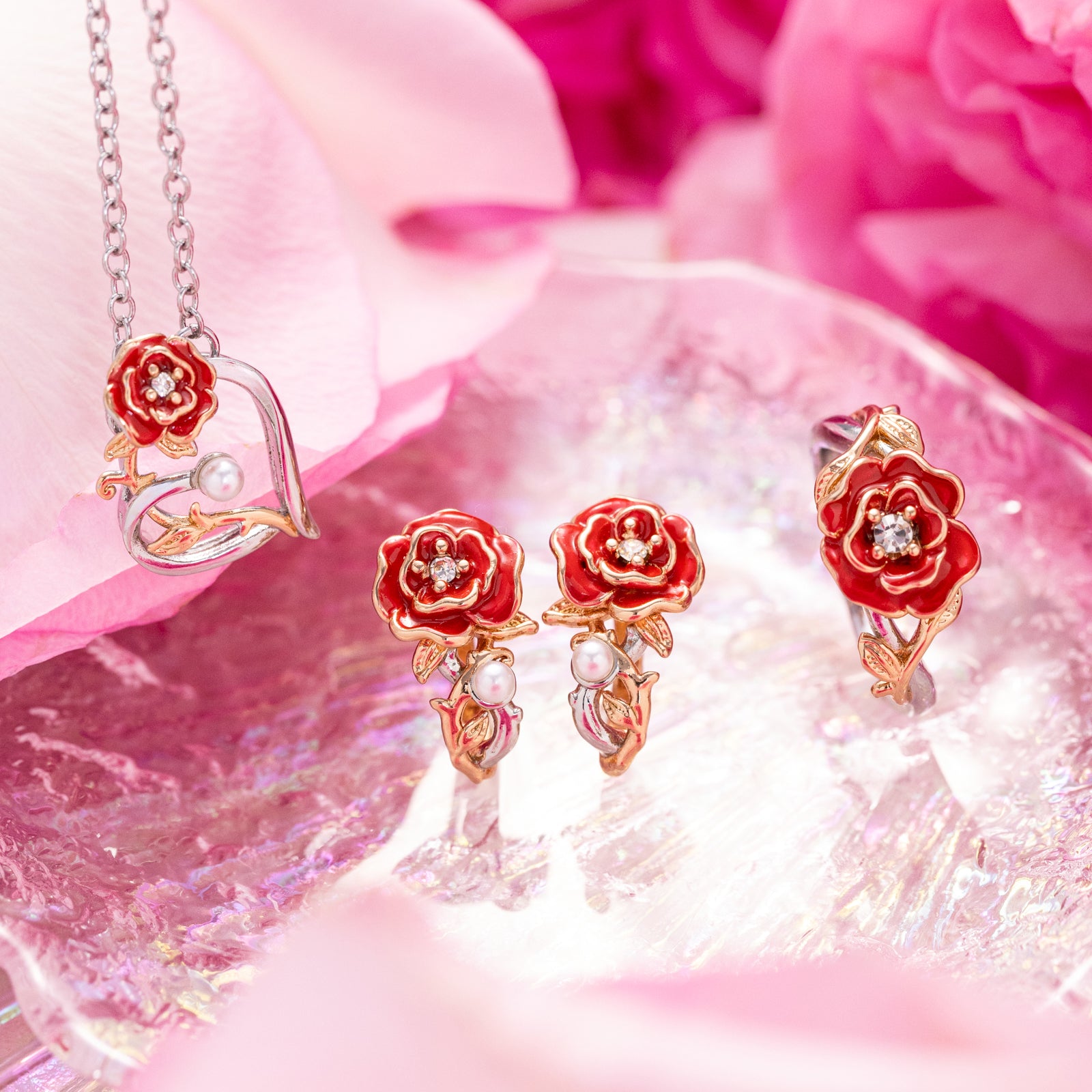 Graceful rose details circle along classic hoops, adding a romantic twist to a timeless silhouette. These Gold Rose Hoop Earrings feature an elegant rose gold tone finish with enamel floral accents, bringing warmth and softness to the design. Light-catching and feminine, they are perfect as Valentine’s Day earrings or as a statement piece of rose-inspired jewelry.