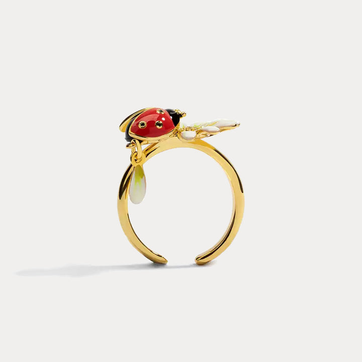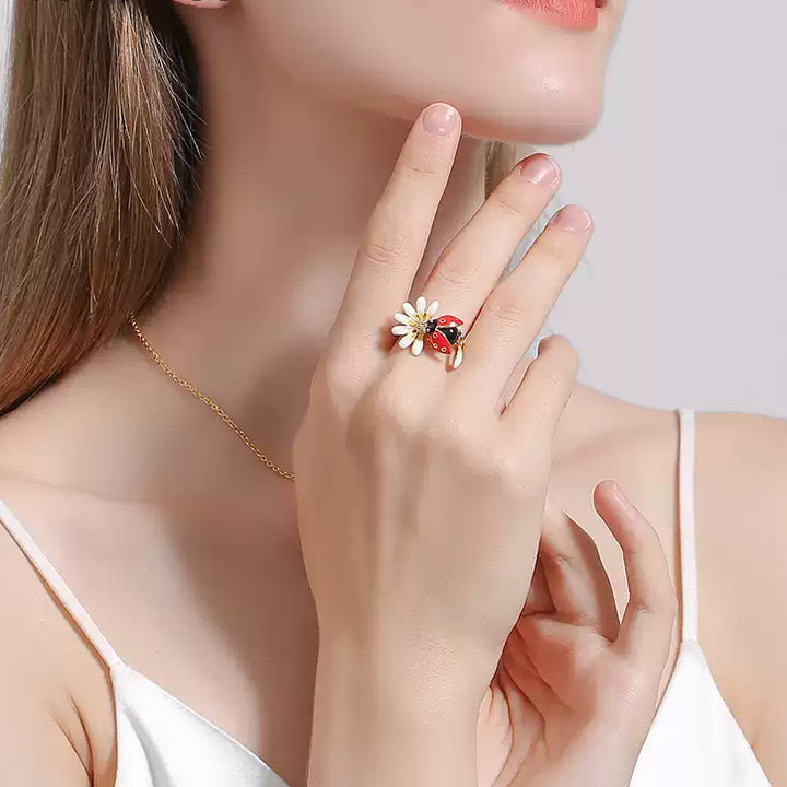 The Ladybug Daisy Ring showcases a striking red ladybug perched on a delicate white daisy, set against a gold band. This whimsical design symbolizes good luck and happiness, with the ladybug representing protection and the daisy embodying purity. A perfect accessory for adding charm and positive energy to any outfit.