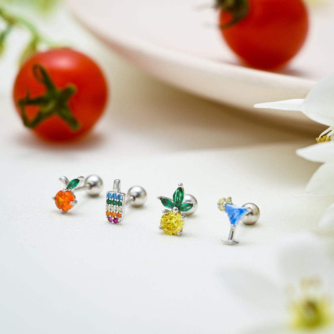 The Silver Fruit Earrings Set is a playful and vibrant collection that celebrates the joy of summer and fruity delights. Crafted from high-quality silver, this set includes four charming earrings, each featuring a unique design: a colorful popsicle, a sparkling lemon, a cheerful cherry, and a refreshing martini.