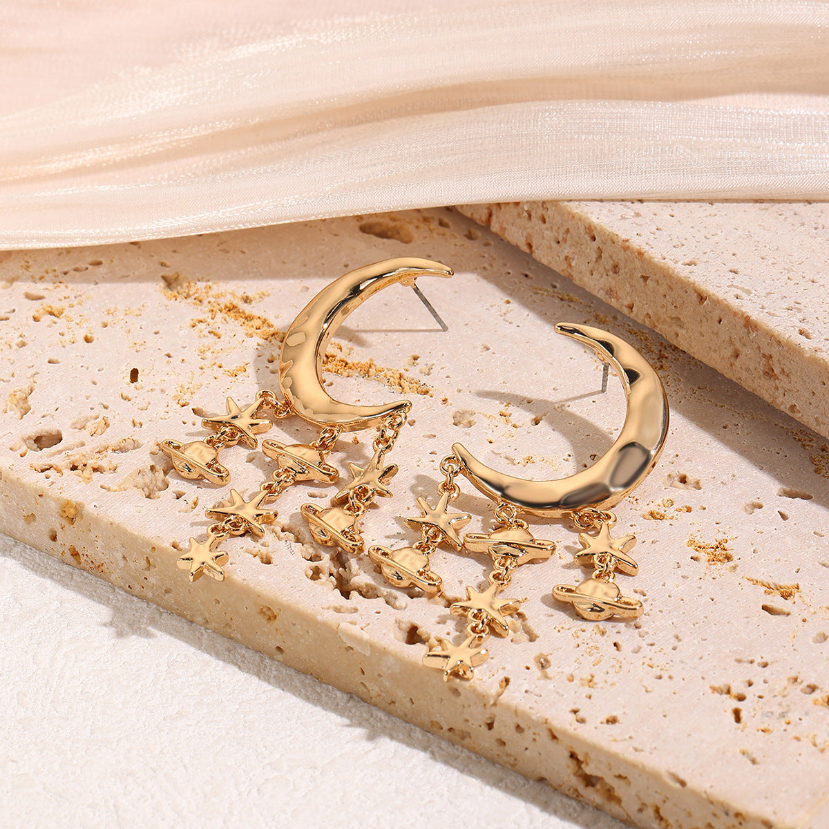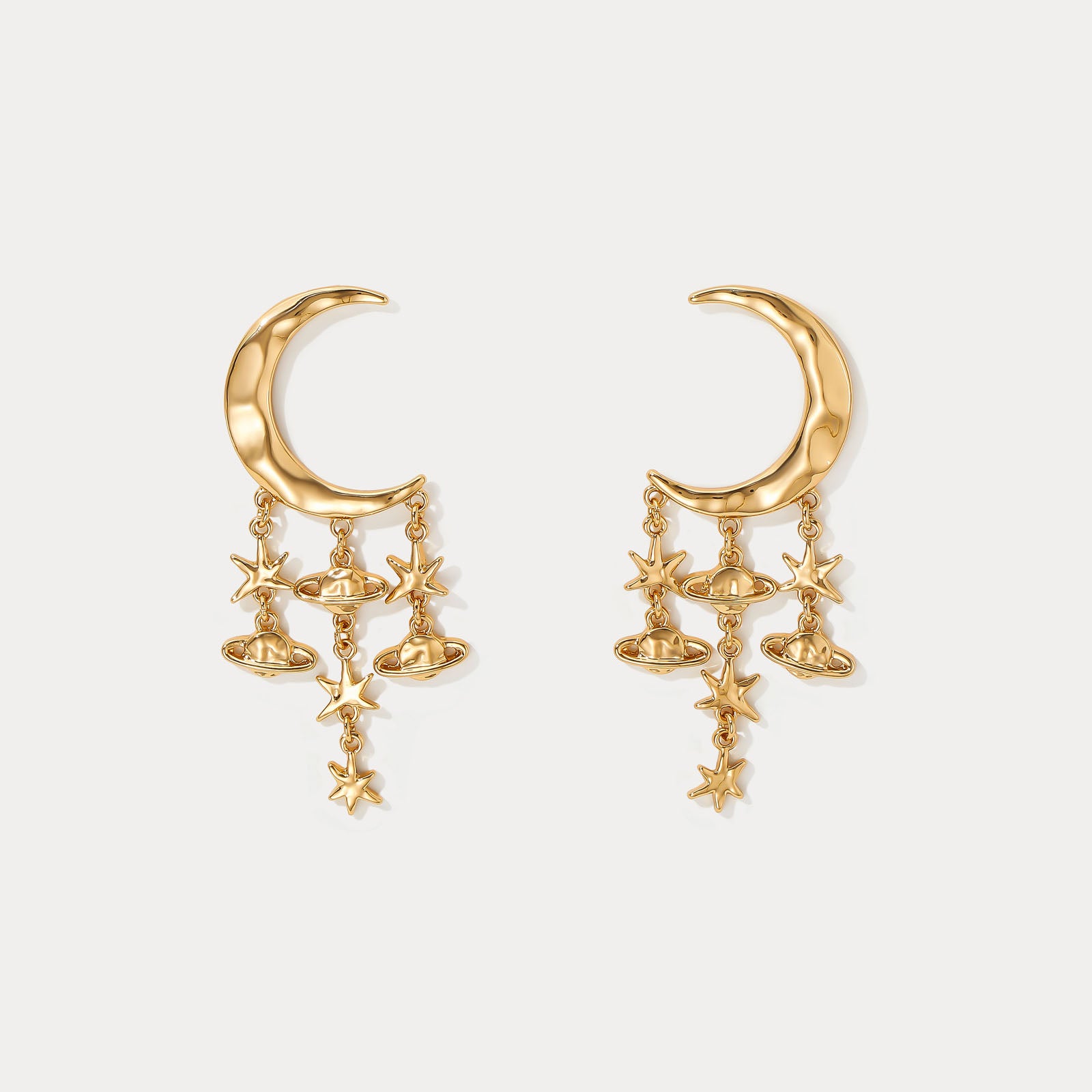 The Moon and Star Dangle Earrings are a celestial-inspired design that captures the beauty of the night sky with graceful movement and soft sparkle. Featuring delicate moon and star details, these earrings blend the elegance of moon Jewelry with the charm of star earrings, creating a dreamy balance of light and shadow. Their flowing dangle design adds a touch of elegance and motion, making them perfect statement earrings for both everyday wear and special occasions. Subtle yet eye-catching, they bring a magical finish to any look while reflecting the timeless appeal of celestial-inspired jewelry.