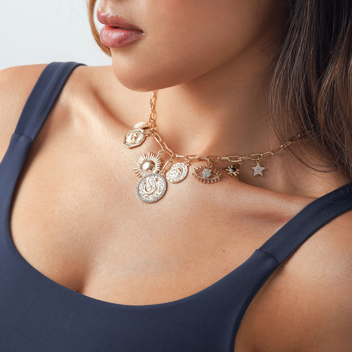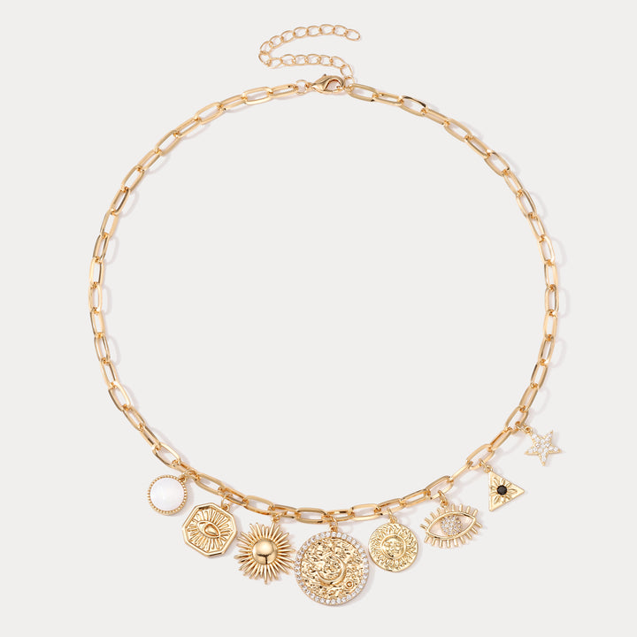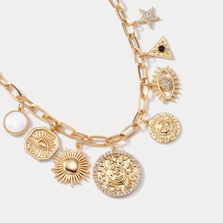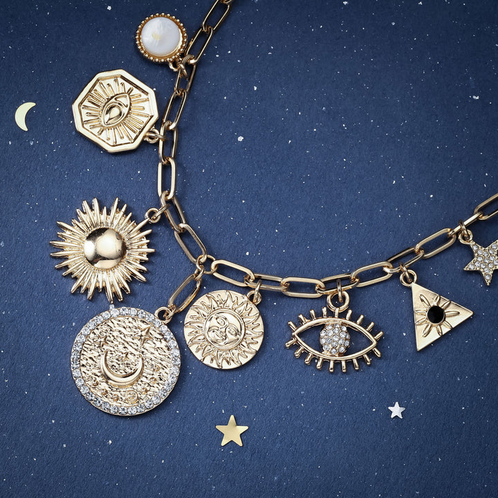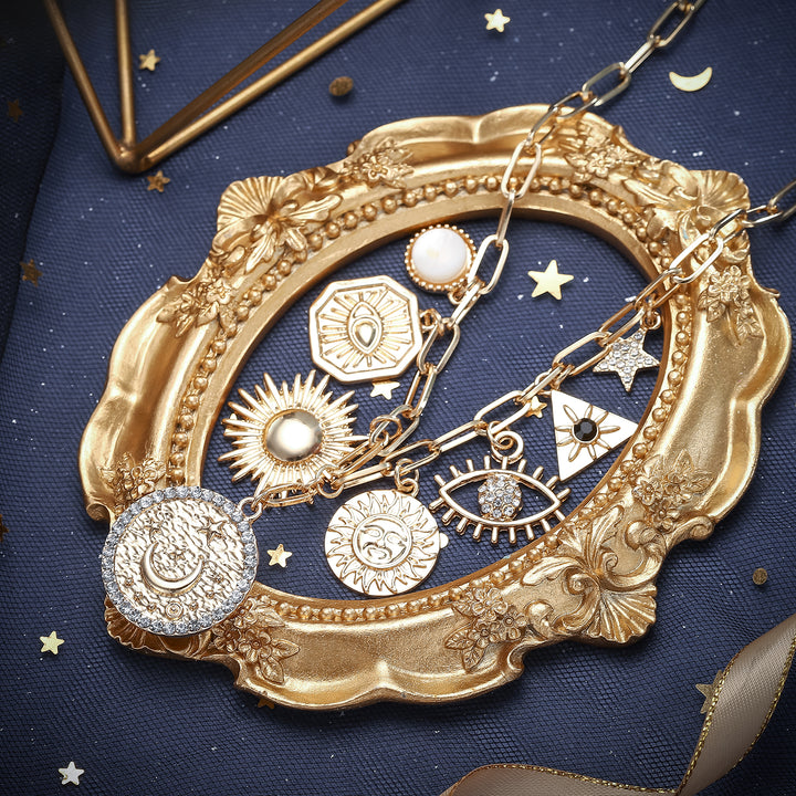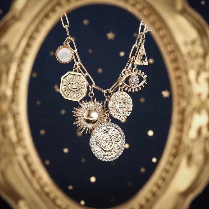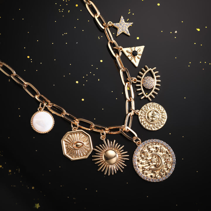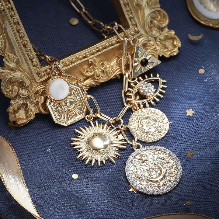 Este collar de lunar Star Evil Eye es un accesorio elegante elaborado con aleación de alta calidad. Está diseñado con un tema celestial, con una luna creciente y una estrella de cinco puntos para un toque de moda y sofisticado. Úselo para hacer una declaración de moda y mantener alejadas la mala suerte y la energía negativa.