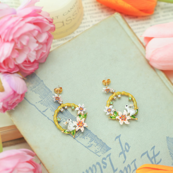 Un capricho caprichoso a través de un jardín lleno de flores florecientes y conejitos saltando. Nuestros aretes de guirnaldas de conejito esponjoso capturan ese momento mágico con su encantador diseño. Cada encanto de conejito, elaborado con latón y esmalte chapado en oro de 18k, agrega un toque de juego a su conjunto. ¡Úselos y deja que tu imaginación deambule libre en un mundo de encanto y elegancia! 🐰✨