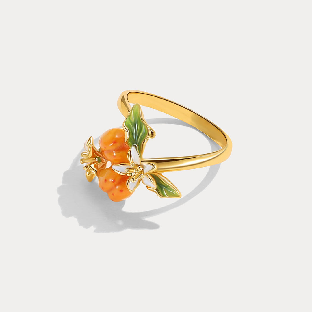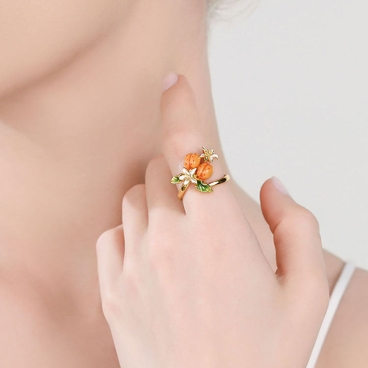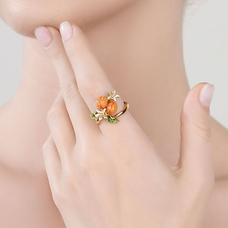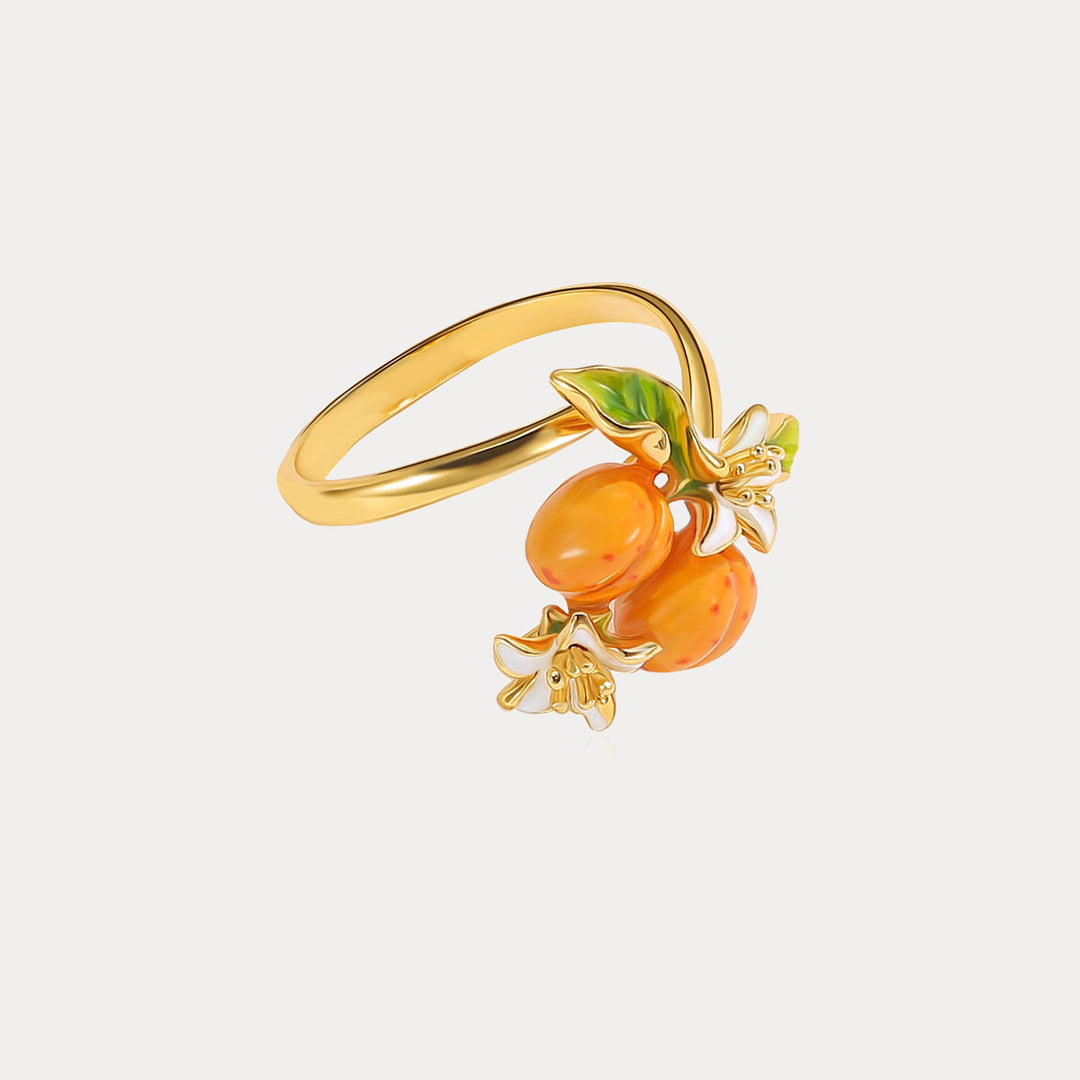 Adorn your hand with the exquisite Golden Plum Flower Ring, a masterpiece that blends nature’s charm with sophisticated craftsmanship. This enchanting ring captures the essence of a flourishing orchard, where golden plums and delicate blossoms come to life in a stunning display of vibrant enamel work. Made from the finest materials, this ring is a true statement piece. The use of enamel adds a glossy finish to the plums and flowers, enhancing their natural beauty and providing a durable, long-lasting sheen. Embrace the splendor of nature and the artistry of fine jewelry with this stunning ring!