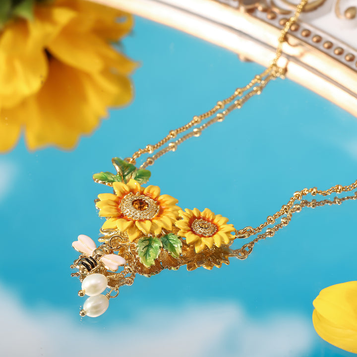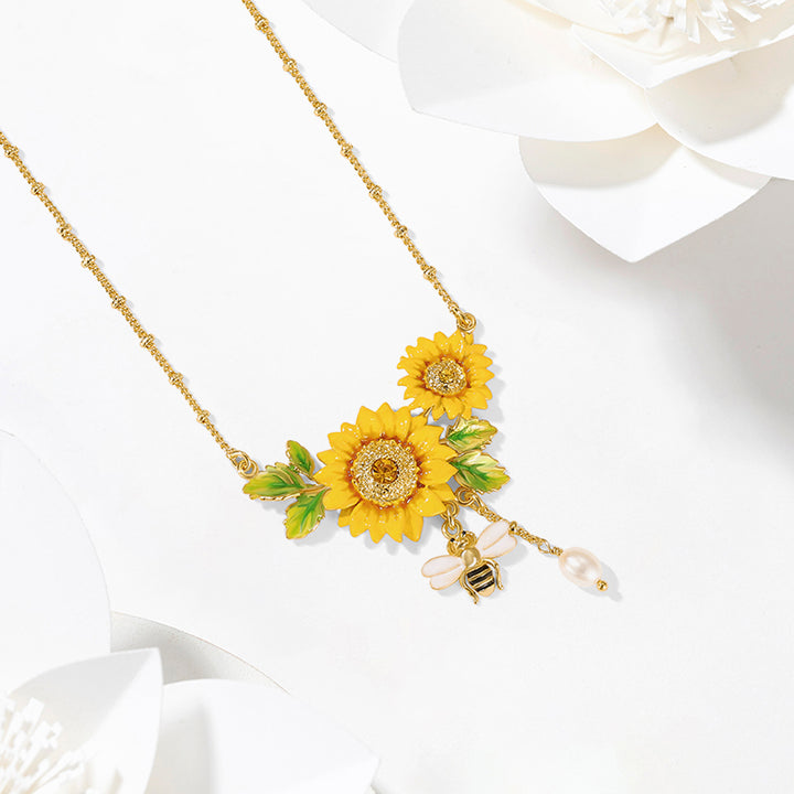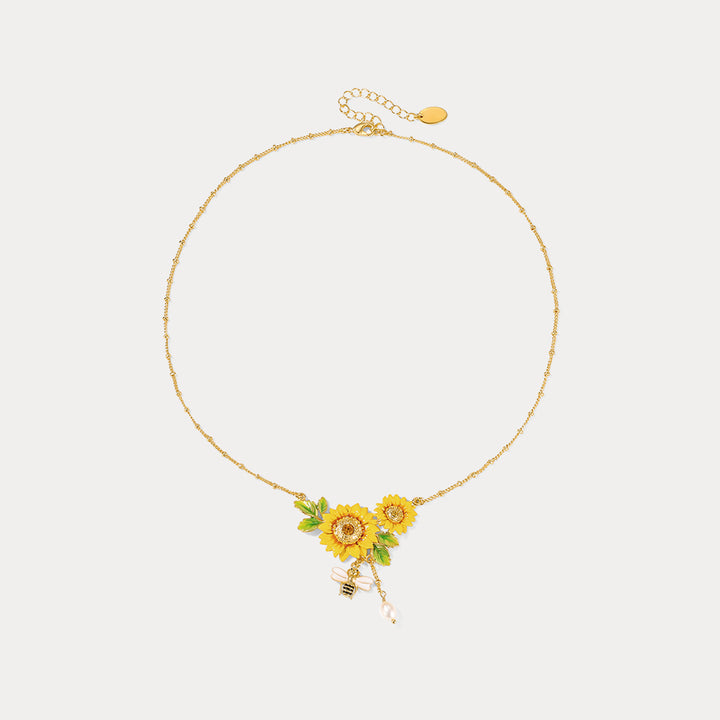 Disfrute de la delicada belleza de la naturaleza con este impresionante collar de girasol y abejas. Hecho a mano de latón y esmalte, presenta un delicado encanto que captura perfectamente la esencia de la amada estética de Cottagecore. Un símbolo de belleza atemporal, se verá simplemente impresionante cuando se usa. Este exquisito collar captura la belleza del verano, con un girasol y una abeja hecha de Sparling Selenichast.