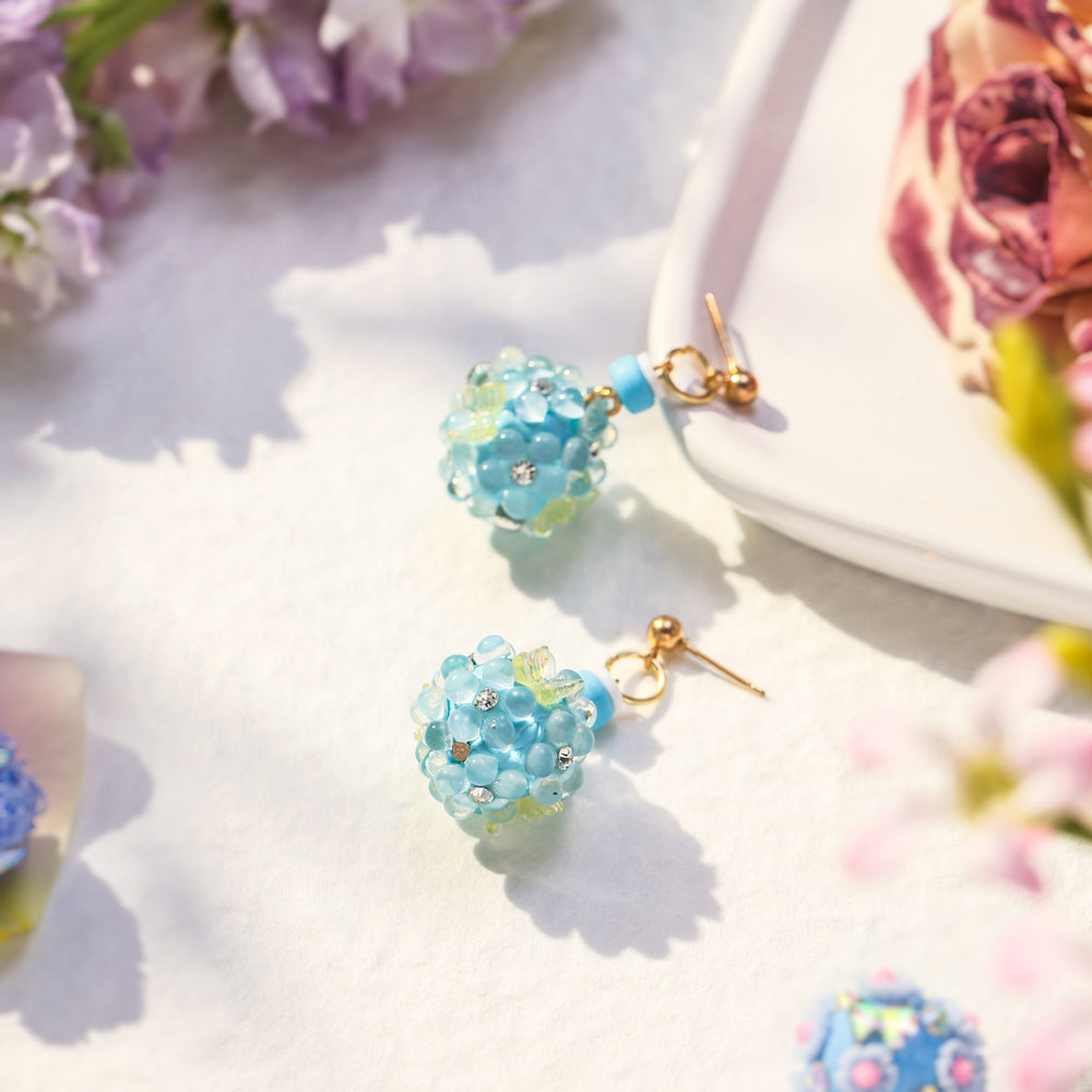 Inspired by hydrangeas, the Blue Bead Hydrangea Earrings feature delicate beaded craftsmanship forming a fresh blue blossom. Translucent blue beads are interwoven with butterfly and rhinestone accents, lively and refined. The lightweight drop design combines gold studs with blue and white elements in perfect harmony, easily complementing everyday outfits. Adding a touch of romantic freshness by the ears, this Hydrangea Earrings brighten your look and express a unique sense of style with their charming details.