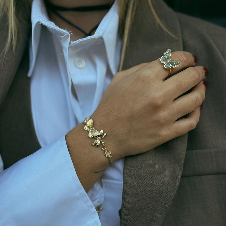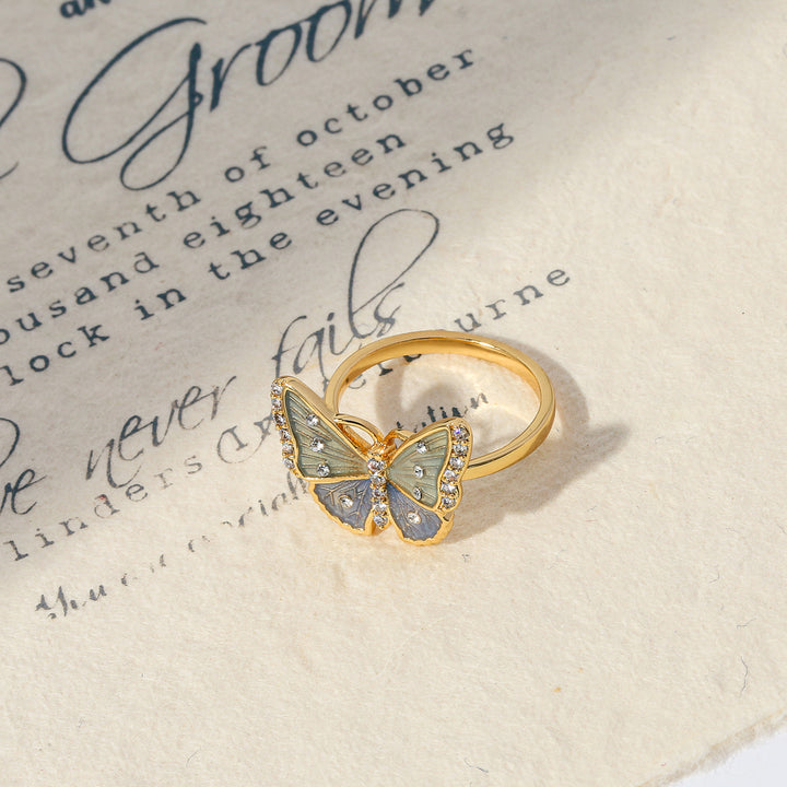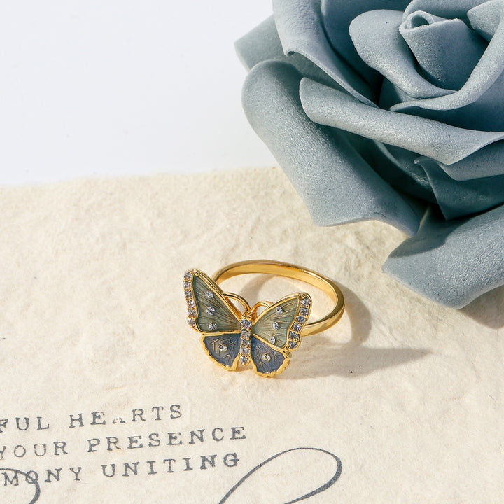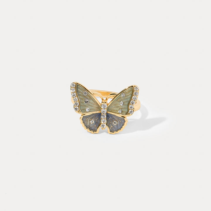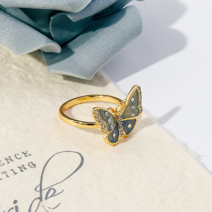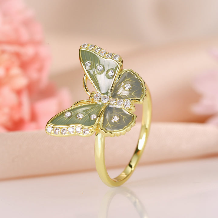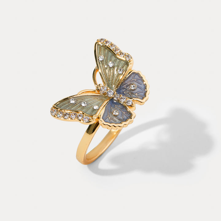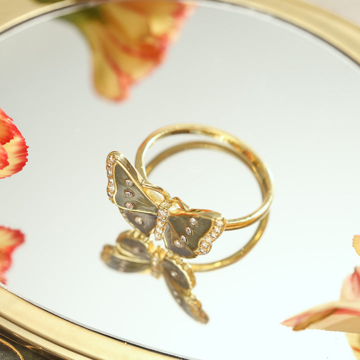 La mariposa, que representa una poderosa transformación, es la forma ideal para con respecto a su autoconciencia. Juguetón y caprichoso, el encanto ha sido pintado a mano delicadamente. Con hermosas gemas marrones y transparentes, este anillo de mariposa se ha convertido en una impresionante pieza de joyería.