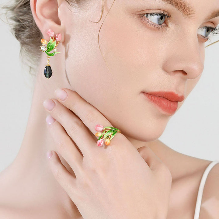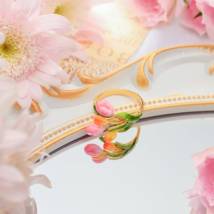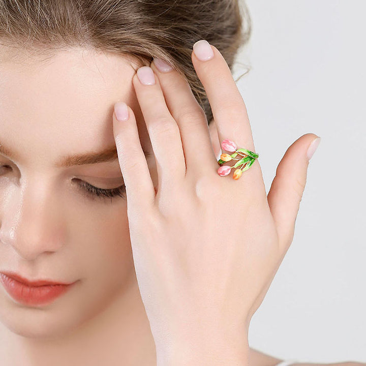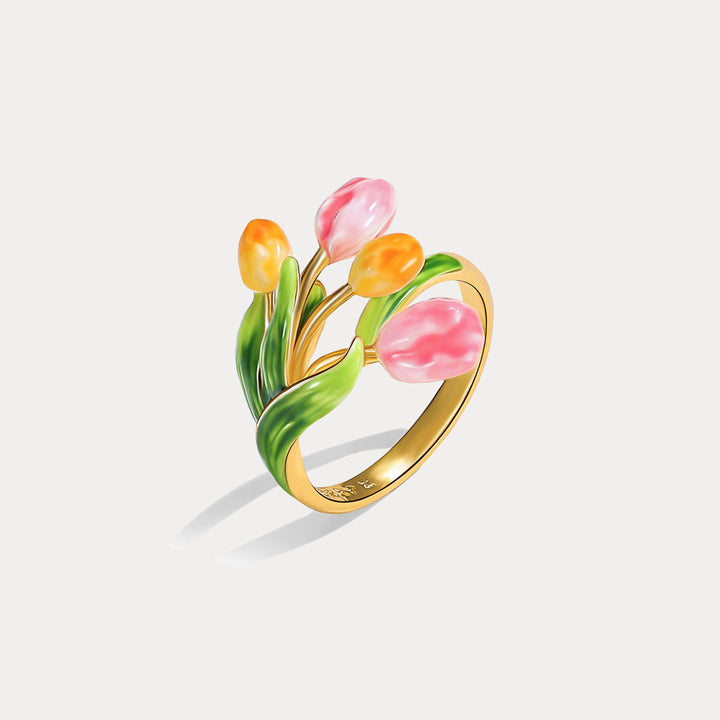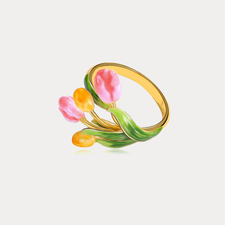 Blossoming like a vibrant vernal dream, the Enamel Tulip Ring encapsulates nature's ephemeral artistry in eternal radiance. Finely sculpted in luxurious 18K gold over brass, its petals unfurl in lush enamel hues that capture the tulip's kaleidoscopic splendor. A brilliant cubic zirconia center glistens like morning dew, beckoning the wearer to embrace the awakening of their most authentic, luminous self. A talisman of rebirth and renewal, this ring encircles the finger with the grace of spring's first blooms, inspiring one to let their spirit blossom unabashedly into the radiant beauty they were always meant to embody.