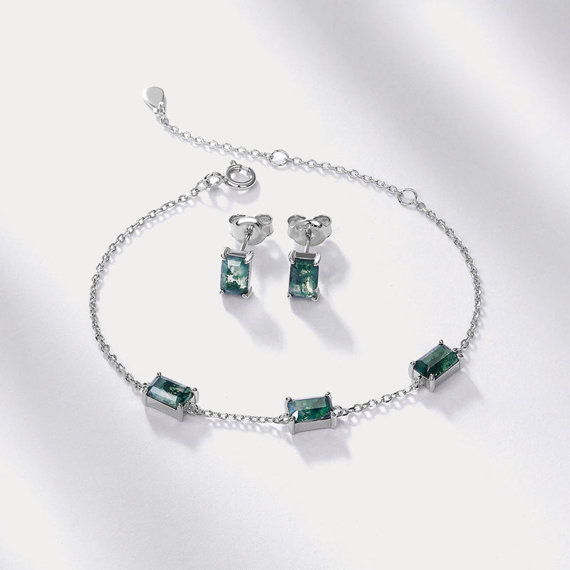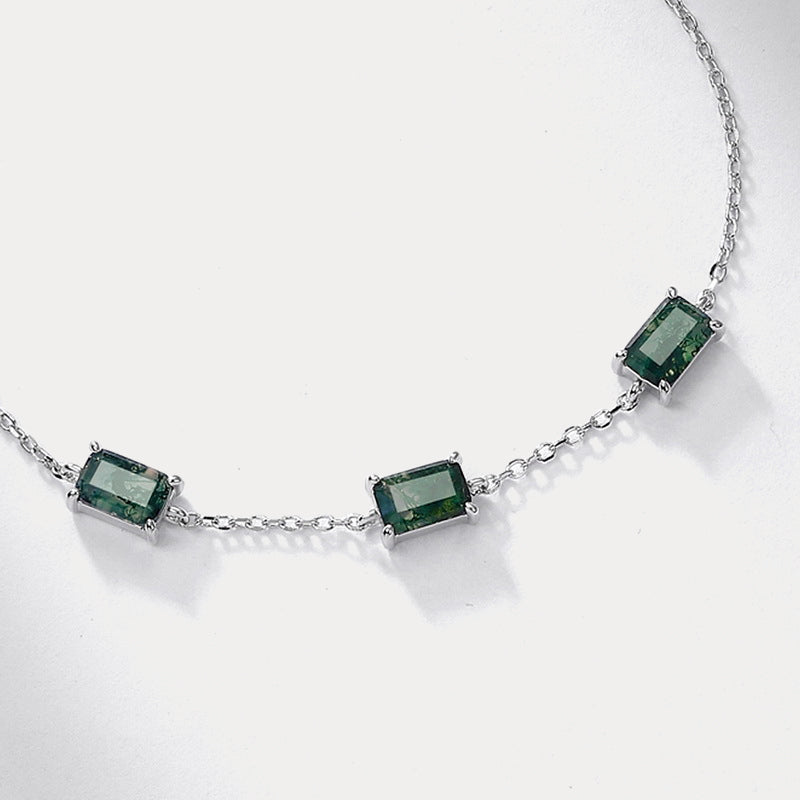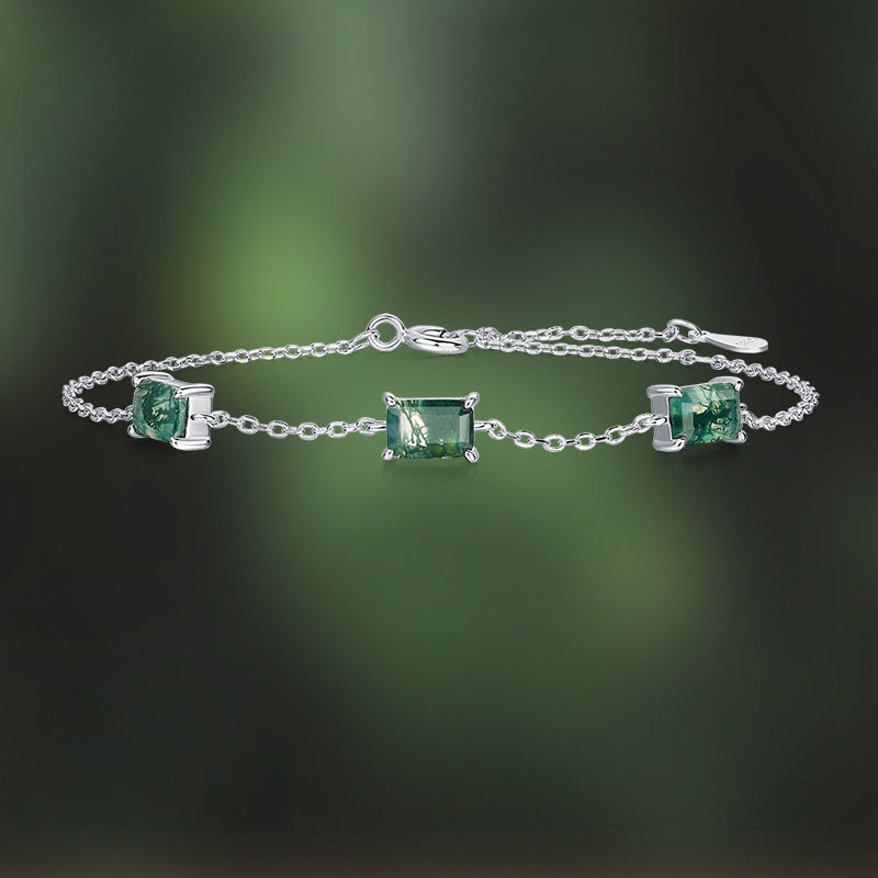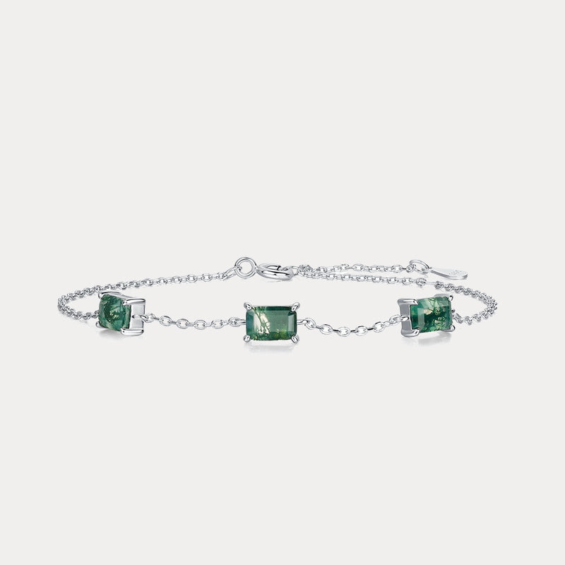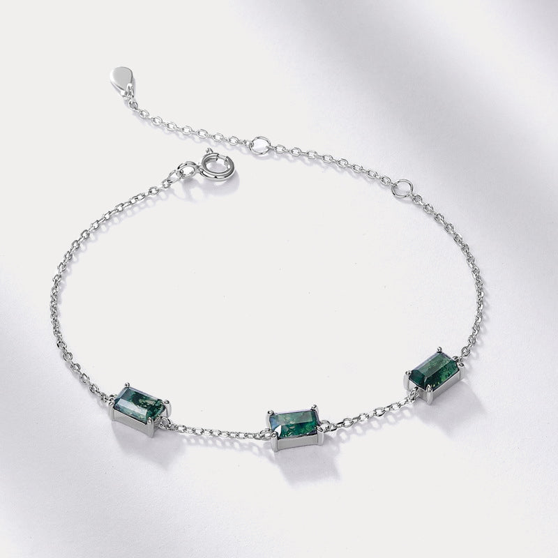 Présentation de notre bracelet en argent Moss Agate exquis, un incarnation délicate d'élégance naturelle et de sophistication raffinée. Cette superbe pièce présente trois pierres de mousse fascinantes, chacune de manière unique ornée d'inclusions vertes complexes qui évoquent la beauté sereine des paysages luxuriants. Situés dans une chaîne d'argent élégante et polie, ces pierres créent un mélange harmonieux de nature et de modernité. Élevez votre style avec la beauté éthérée de notre bracelet Silver Moss Agate.