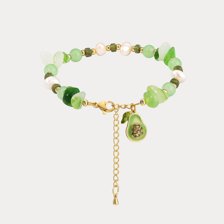 Savourez l'attrait irrésistible du superaliment convoité de la nature avec le bracelet d'avocat captivant. Meticulement fait avec des charmes émaillés en laiton en laiton en or 18 carats et vibrants capturent les teintes riches et crémeuses de la chair de l'avocat, tandis que de délicates perles d'eau douce évoquent sa texture succulente. Chaque charme miniature est une œuvre d'art fantaisiste, conçue avec amour pour capturer la bonté nourrissante et le charme indulgent de ce fruit bien-aimé. Lancé sur une chaîne délicate, les charmes d'avocat pendent gracieusement, ajoutant une touche de charme fantaisiste et d'attrait alléchant à tout ensemble. Célébrez les plaisirs luxueux de la générosité de la nature avec ce délicieux bracelet perlé vert.