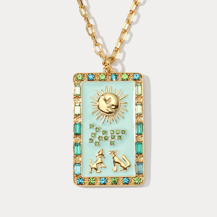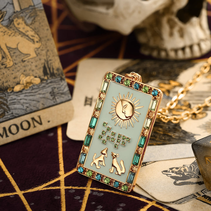 Présentation du collier de Tarot Moon - Un superbe bijou astrologique moderne à base de laiton émaillé. Parfait pour offrir aux amateurs d'astrologie et de tarot, ce collier luxueux incarne un style sophistiqué qui évoquent certainement les mystères du ciel nocturne et ravit tous ceux qui voient sa beauté.