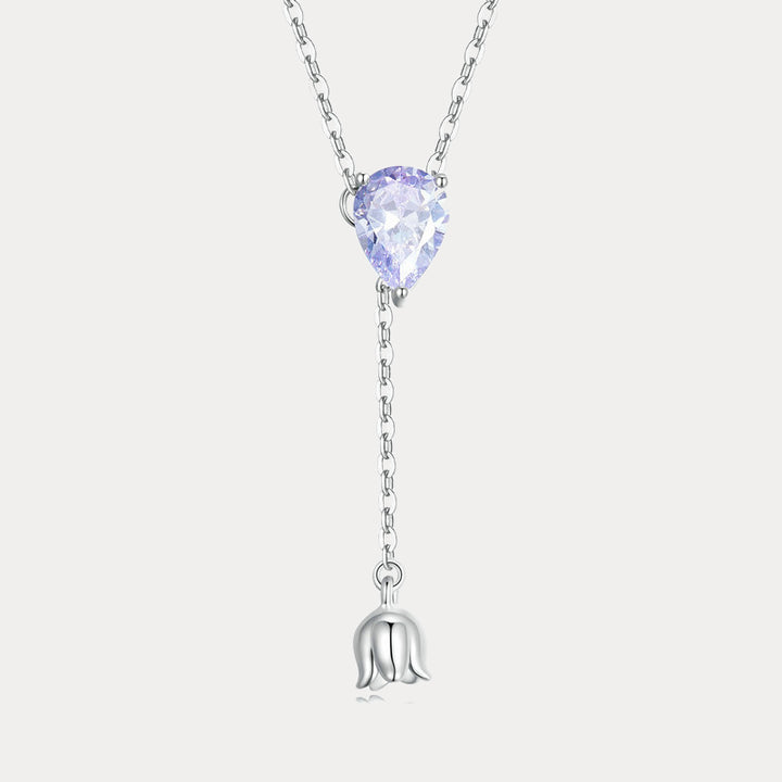 Un zircon violet en forme d'eau qui est relié par la chaîne en forme de O est noble et élégant, et un lys délicat de la vallée tombe en dessous, qui est plein de beauté intelligente.