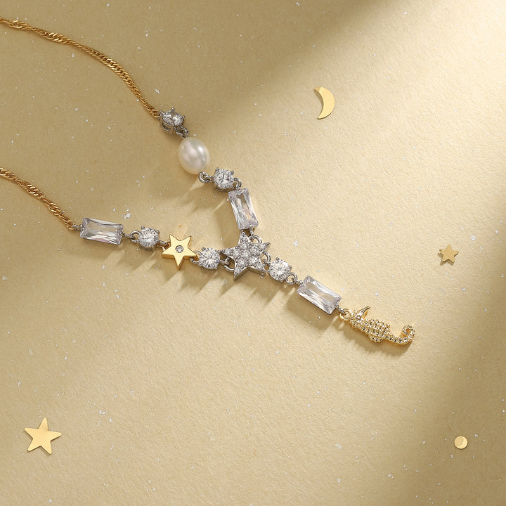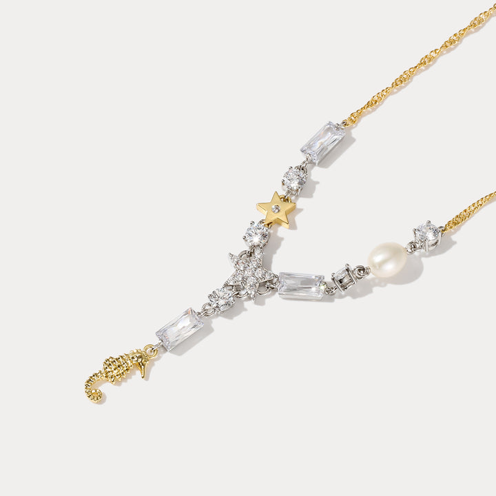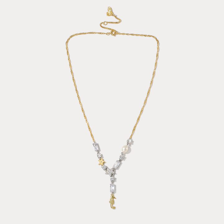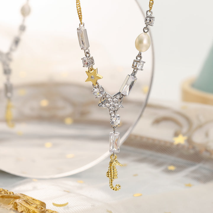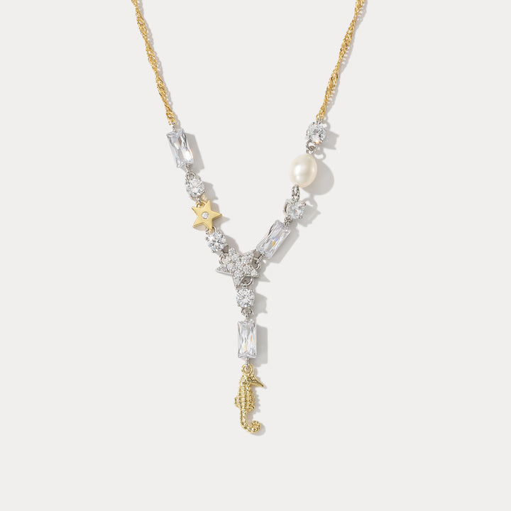 Commémorez votre style d'inspiration maritime avec ce collier d'étoile d'hippocampe unique. Fabriqué à partir des meilleurs matériaux, chaque pièce présente un design d'hippocampes détaillé avec un charme en forme d'étoile pour le mélange parfait de luxe et de fantaisie. Élégant et de bon goût, cette belle pièce peut être portée en rappel de la puissance de la mer.