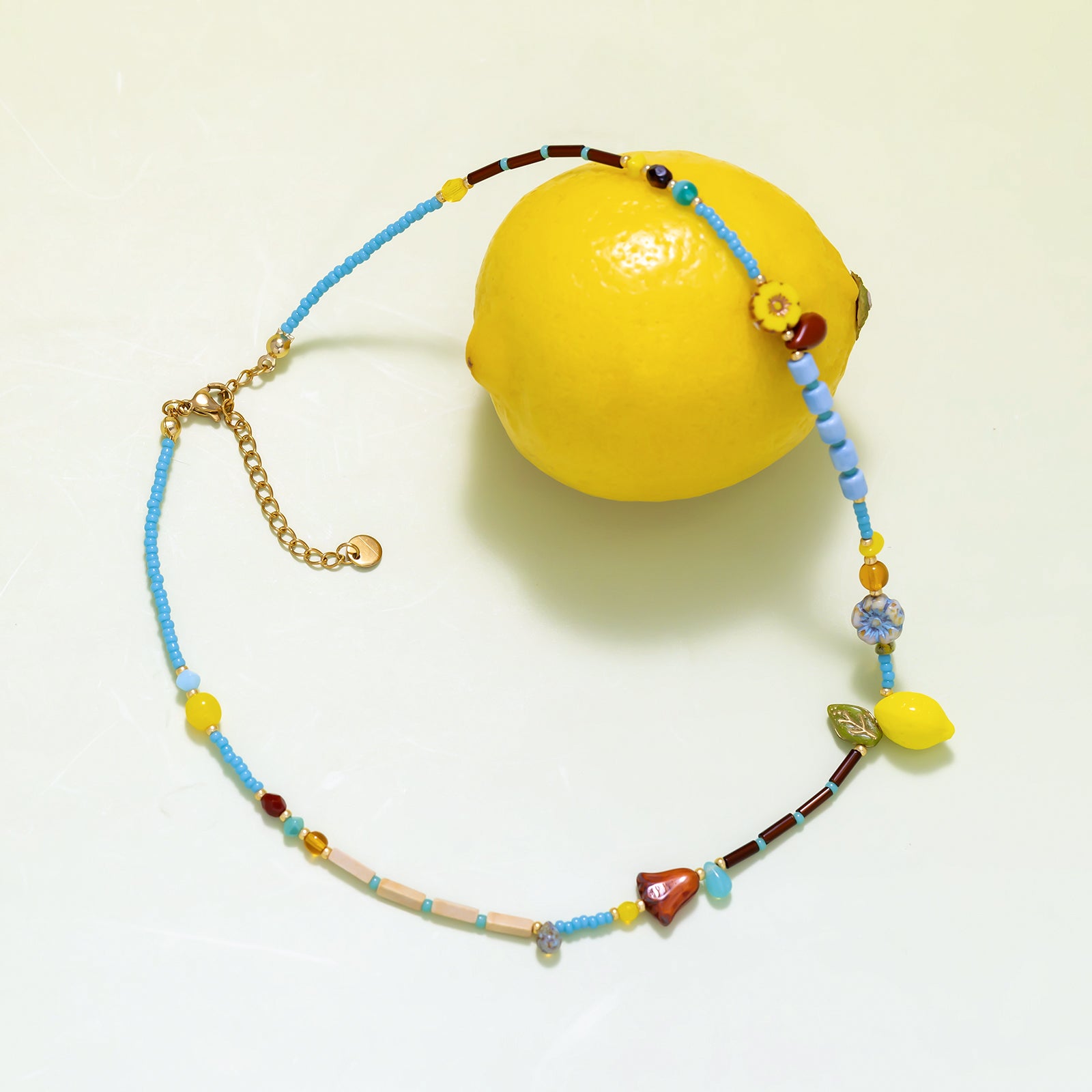 Rows of colorful Czech glass beads frame a lively lemon detail, forming a beaded necklace that feels made for sunshine. The quality Czech beads enhance durability and brilliance, while the fruit motif brings a refreshing summer jewelry vibe. Worn as a statement necklace or layered with minimalist chains, it adds personality without overpowering the look. A fun and vibrant gift for her, perfect for summer outings and holiday styling.🍋