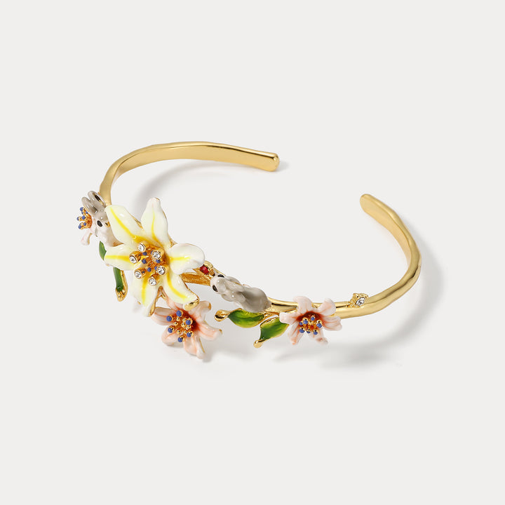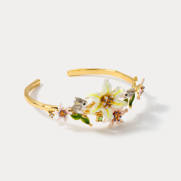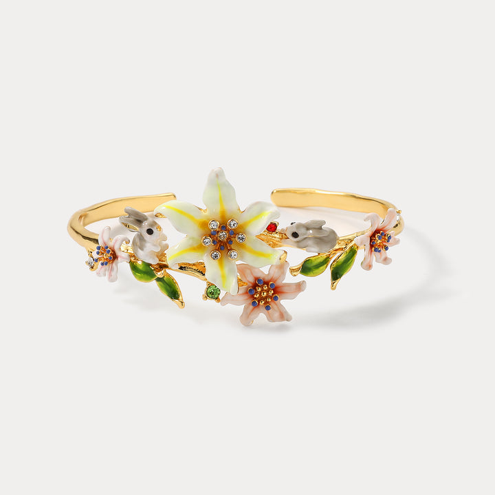 Entrez dans le monde enchanteur de notre bracelet de manchette de lapin moelleux - un délicieux clin d'œil aux merveilles de la nature! Cette charmante pièce capture l'essence d'un jardin en fleurs avec des détails d'émail complexes, tandis que l'or 18 km ajoute une touche de luxe. Embrassez l'esprit ludique de notre adorable design de lapin, apportant de la joie et du style à votre poignet. Un choix parfait pour les amoureux de la nature! 🐰🌼🌿