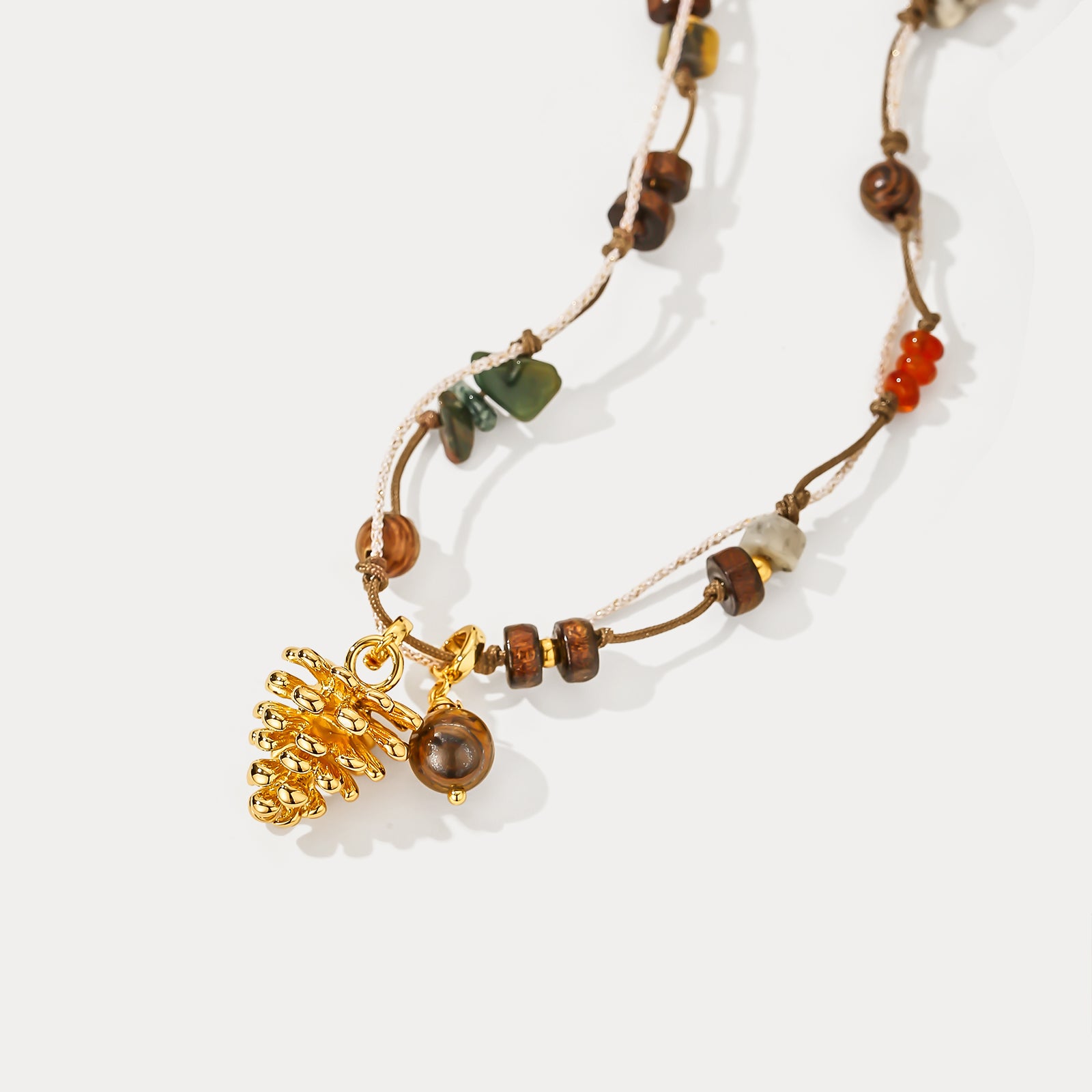 Tiger eye stone anchors this necklace with warm depth, complemented by a golden pinecone motif inspired by nature. The gemstone jewelry design reflects grounding energy and woodland symbolism, aligning with nature inspired jewelry trends. Its balanced proportions make it suitable for both layering and solo wear. A meaningful birthday gift for her who loves earthy statement necklaces.
