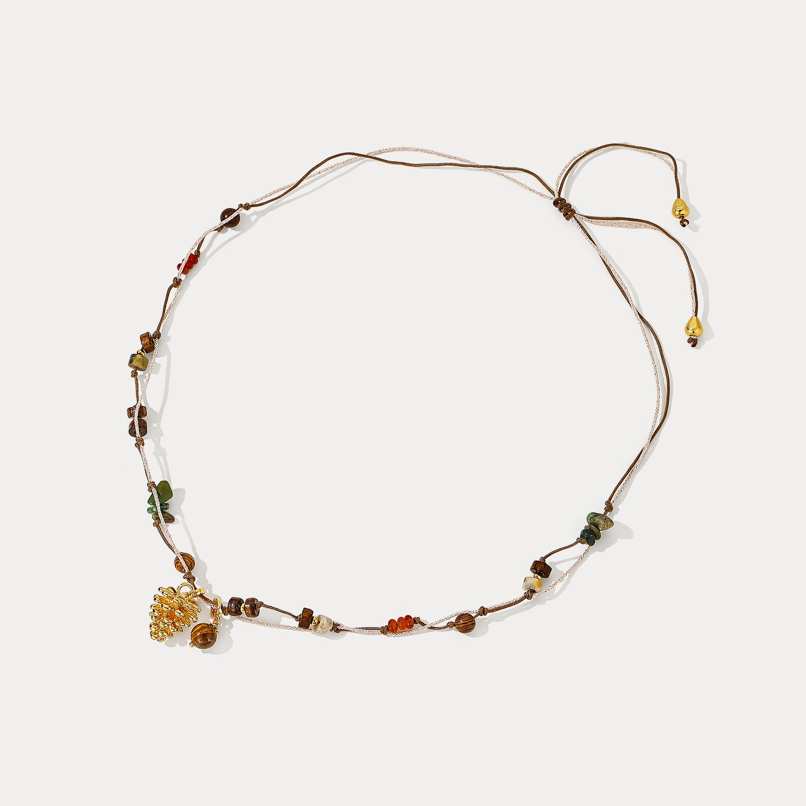 - Materials: 10K Gold on Brass, String, Tiger Eye Stone