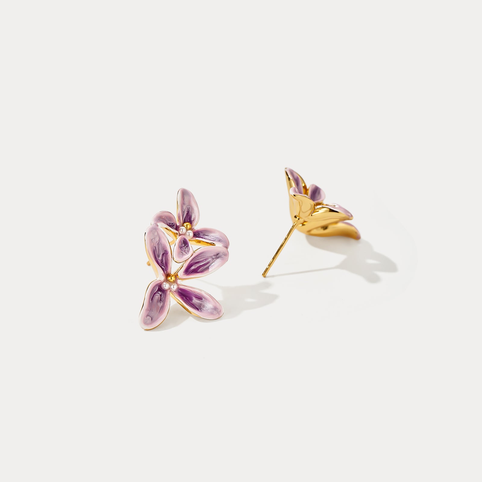 Lilac blossoms take shape in these delicate stud earrings, bringing soft floral charm to daily wear. The nature inspired jewelry aesthetic blends seamlessly with modern minimalist styling, making them easy to mix with other pieces. Their gentle color adds a hint of freshness without overwhelming the look. A thoughtful gift for her who appreciates floral jewelry and understated elegance.