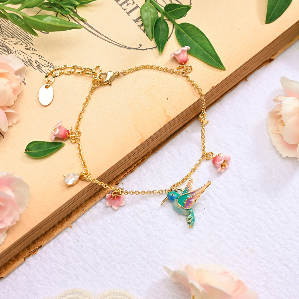 Elevate your style with a touch of nature's wonder through our Enamel Hummingbird Bracelet, a piece that artfully captures the vibrant spirit of the hummingbird. This bracelet features a beautifully crafted hummingbird charm, brought to life with a vivid blend of blue and green enamel that reflects the bird's lively essence. The delicate design of the hummingbird, mid-flight, adds a dynamic element to this exquisite piece. The specialty of this bracelet lies in its ability to blend playful charm with refined craftsmanship. Let this bracelet be the piece that brings a little bit of nature’s magic to your jewelry collection, adding both beauty and meaning to your style.
