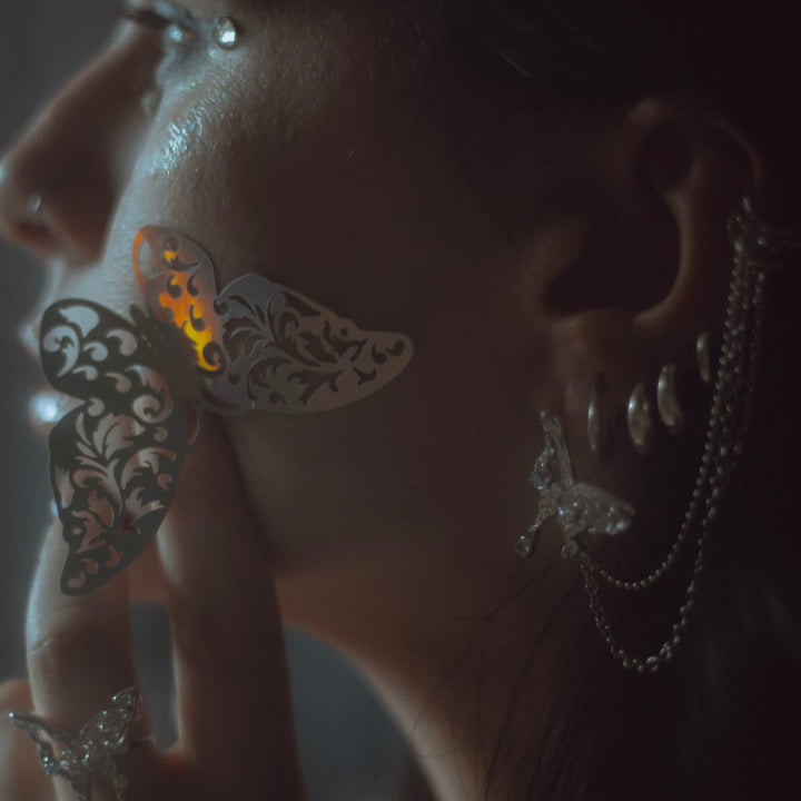 Ecco il nostro incantevole "anello di farfalla Aurora che scioglie", una testimonianza accattivante di grazia e bellezza. Questo anello regolabile presenta delicati motivi a farfalla adornati con diamanti blu scintillanti, messi su uno sfondo di palladio lucido. Lascia che il tuo stile prenda il volo con questo squisito pezzo, regolabile per adattarsi alla tua affascinante espressione di bellezza.