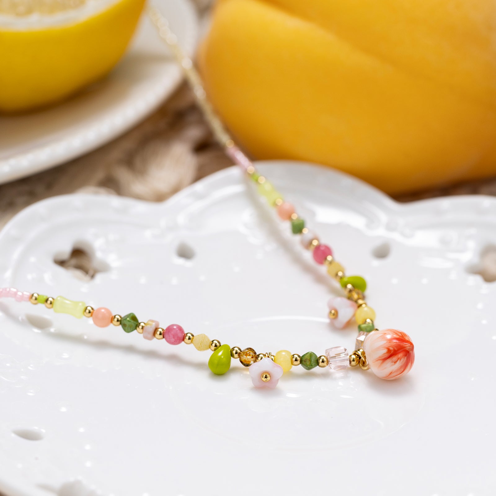 Inspired by juicy peaches, the Peach Beaded Necklace blends ivory beads with pink, green, and gold tones, finished with a lifelike peach pendant for a fresh, sweet vibe. This Czech Glass Bead Necklace is handcrafted with care, featuring flowers, droplets, and other delicate details that add a romantic touch. The soft hues and vivid peach charm make this Peach Beads Necklace lightweight, versatile, and eye-catching. Pair it with a simple T-shirt to brighten your look, wear it on a date or to afternoon tea for a sweet mood, or take it to a summer market or music festival to show off your playful personality. 👉 Shop More Fruit Jewelry.