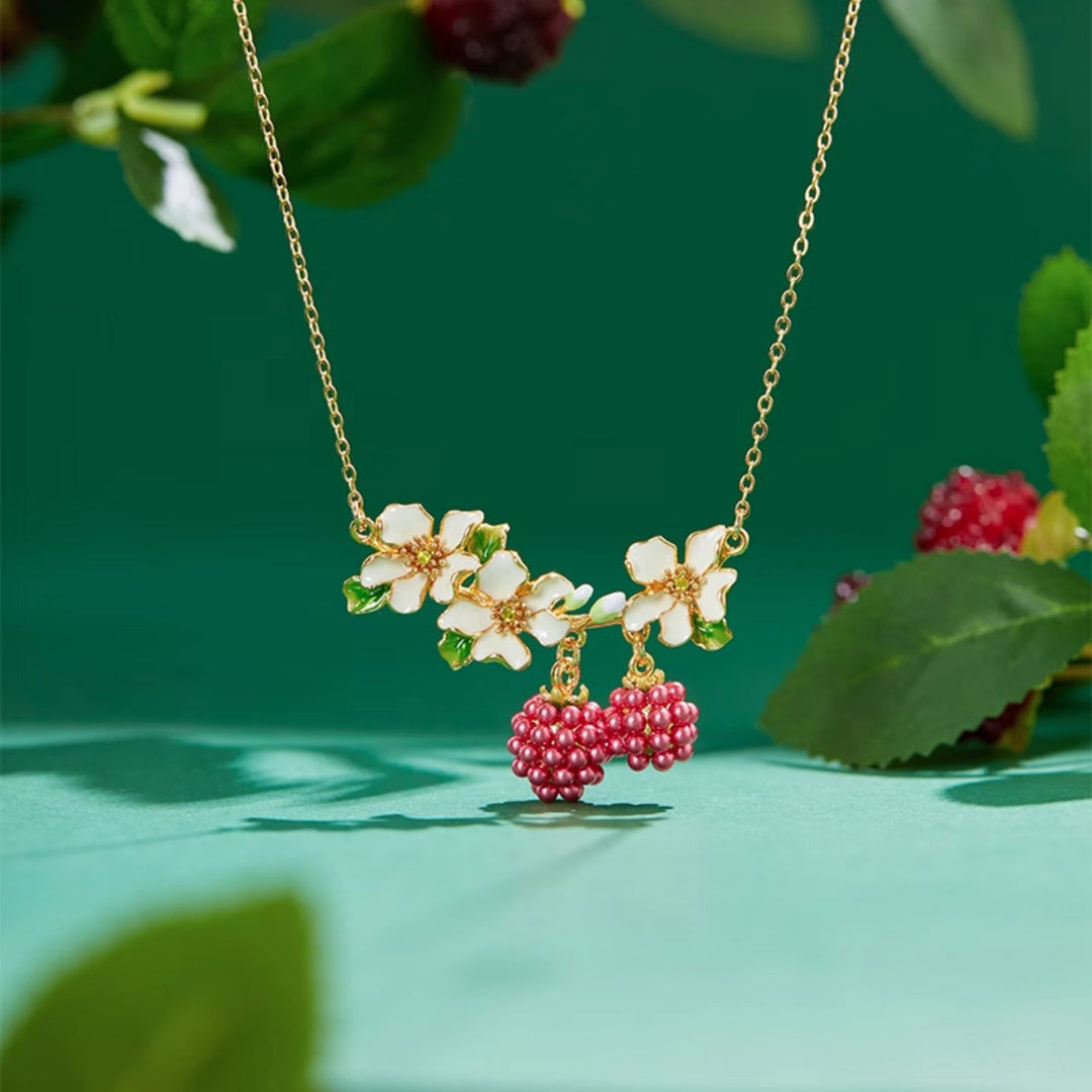 This nature-inspired necklace features delicate raspberries and flowers pendant on a sweet chain. Bring a touch of sweetness and charm to any outfit with this gorgeous piece. Perfect for nature lovers and anyone looking for a unique and beautiful accessory.