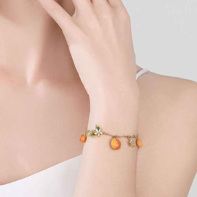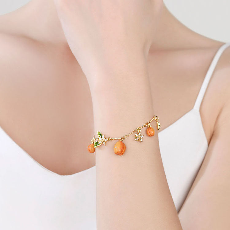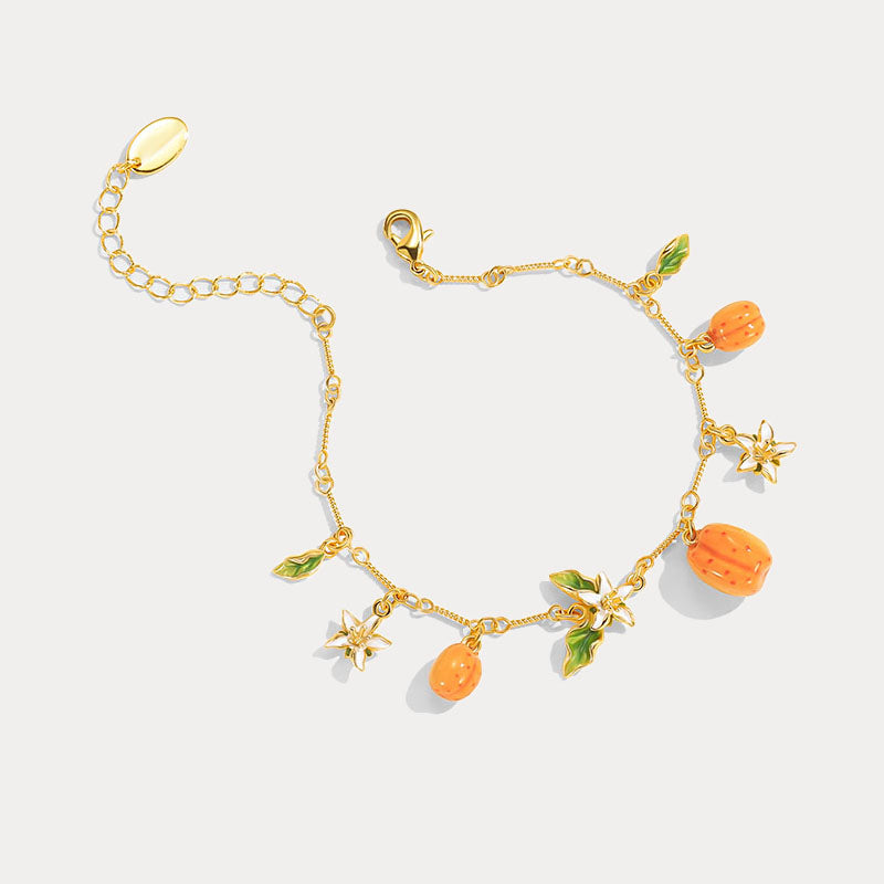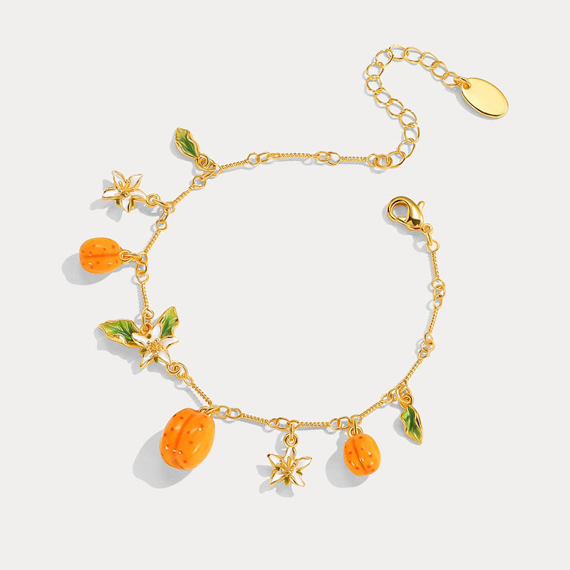 Adorn your wrist with the exquisite beauty of our Golden Plum Flower Bracelet, a piece that embodies the delicate grace of nature with an added touch of luxury. This enchanting bracelet is a celebration of nature’s finest elements, intricately designed to bring a sense of elegance and refinement to your jewelry collection. This bracelet features a series of finely crafted charms, each one representing the splendor of a flourishing garden. The golden plums, rendered in vibrant enamel, are the centerpiece of this design, their rich amber tones glowing with a warm, inviting hue. Let this piece become a cherished part of your collection, a reminder of the elegance and artistry that fine jewelry can bring to your life.