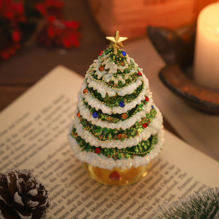 La scatola di binnascine ingioiellata sull'albero di Natale di neve è una scatola di gioielli affascinante e decorativa. Realizzato con materiali di alta qualità come lega e adornato con gioielli scintillanti, mette in mostra un bellissimo design di un albero di Natale coperto di neve. Questa scatola di ninnoli funge da deliziosa decorazione offrendo un'opzione di archiviazione sicura ed elegante per gioielli o piccoli ricordi. Fa un regalo meraviglioso per le festività natalizie, catturando la magia e la bellezza dell'inverno.
