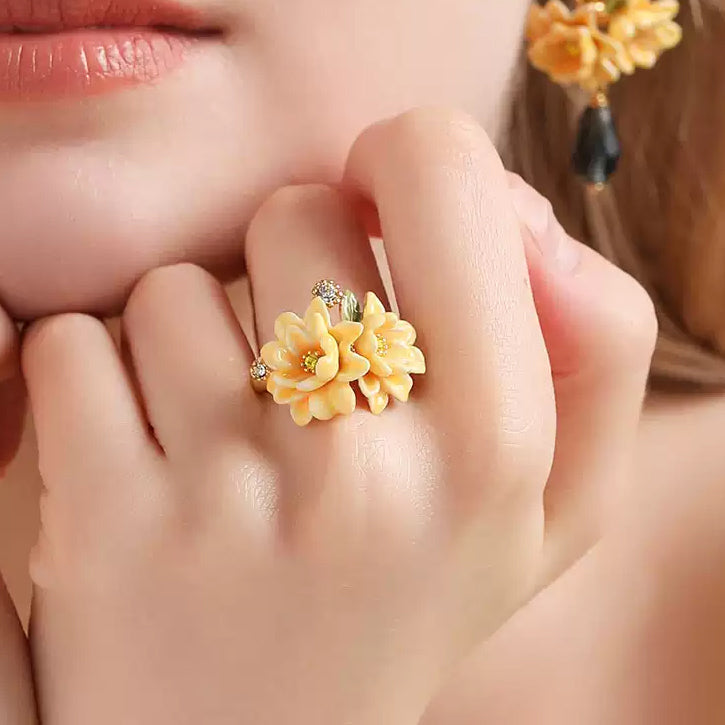The Gardenia Flower Ring showcases the captivating beauty of the gardenia, a symbol of purity, love, and grace. This ring features a delicate cluster of meticulously crafted gardenia blossoms, accented with sparkling gemstones that catch the light with every movement. The open band design adds a modern touch, while the gardenias themselves embody timeless elegance and heartfelt emotion. More than just a piece of jewelry, this ring is a wearable reminder of the beauty and grace within, adding a touch of romance and sophistication to any look.