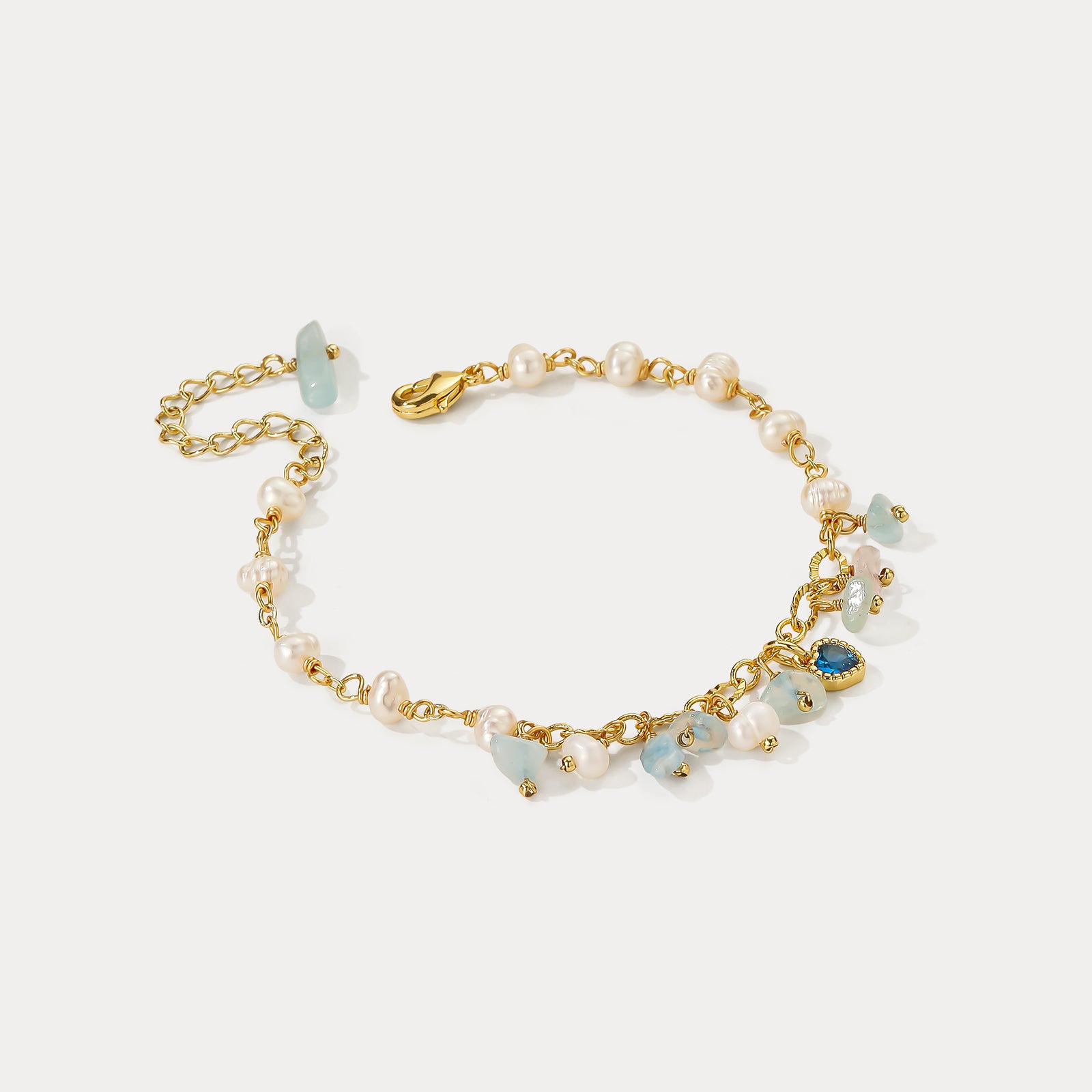Aquamarine stones reflect the calm clarity of ocean light, bringing a refreshing tone to this charm bracelet. The cool blue gemstone pairs beautifully with neutral outfits and summer styling, making it a standout piece in any gemstone jewelry collection. Designed for stacking or solo wear, it offers both versatility and meaning. A serene and elegant gift for her.