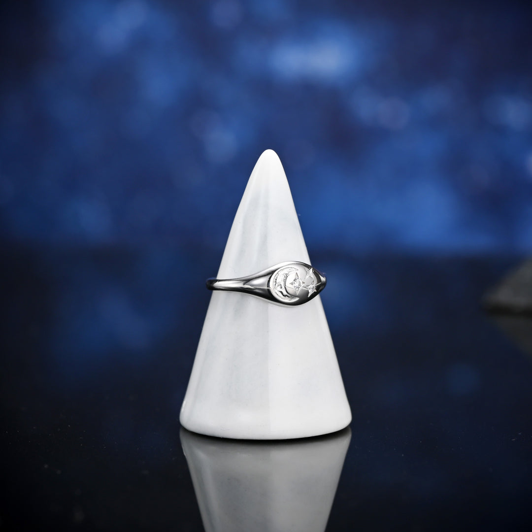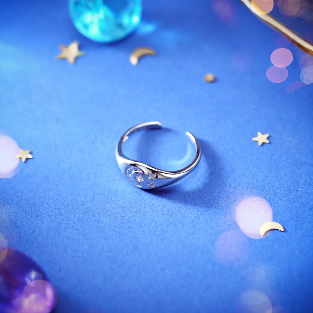 Add a touch of celestial beauty with our Moon and Star Silver Ring. Crafted from high-quality silver, this ring features intricate details of a delicate moon and star design. Elevate your look and embrace the magic of the night sky with this stunning piece.