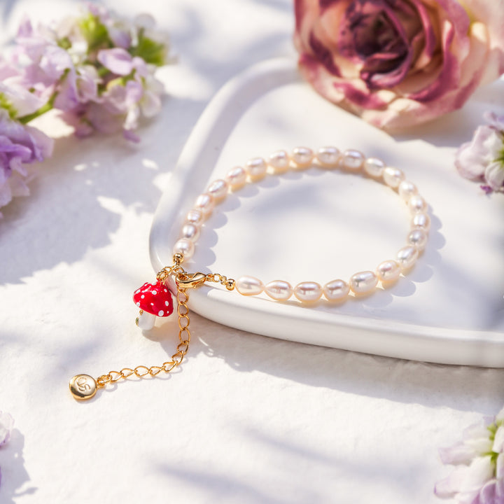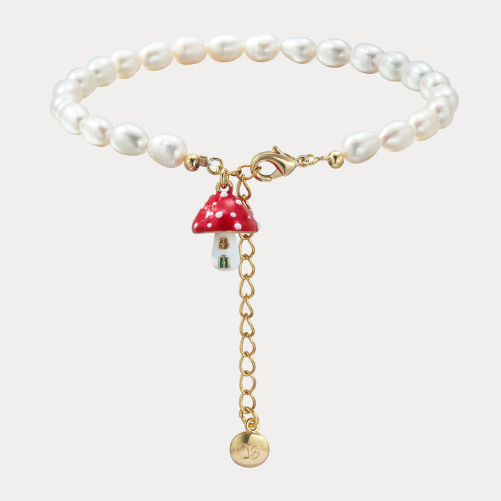 Blend classic elegance with a touch of fairy-tale whimsy in this mushroom bracelet, combining smooth pearls with playful mushroom designs. Featuring the red-capped white-spotted motif and delicate details, it creates a unique and refined wrist statement that stands out in any jewelry collection. Versatile enough to complement various styles, the mushroom charm bracelet fits perfectly with both simple, polished office looks and elegant evening gatherings. Wearing this Mushroom Pearl Bracelet not only elevates your outfit but also showcases your distinctive taste for unique design and fresh inspiration, making it a captivating piece that sparks conversation and highlights refined aesthetics.
