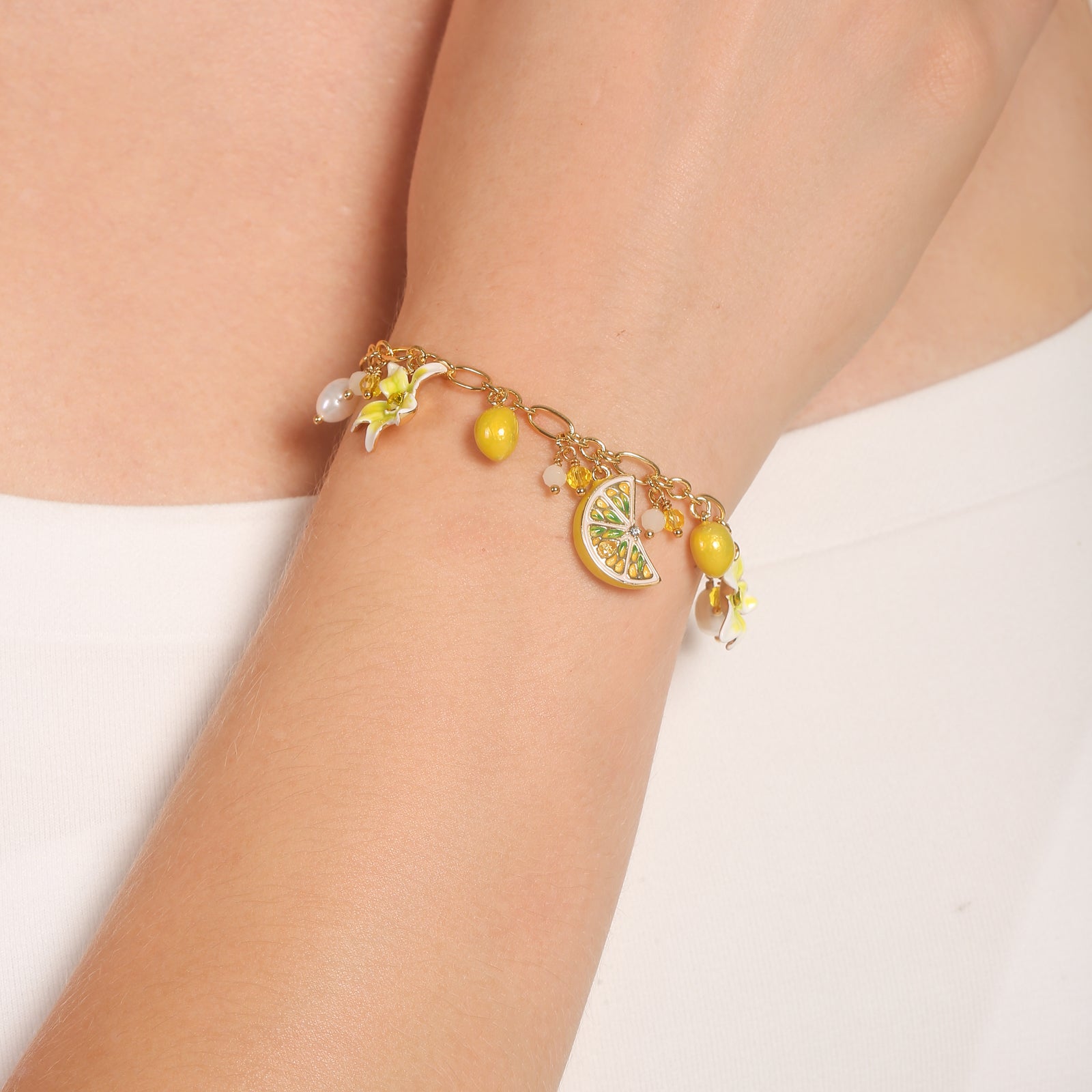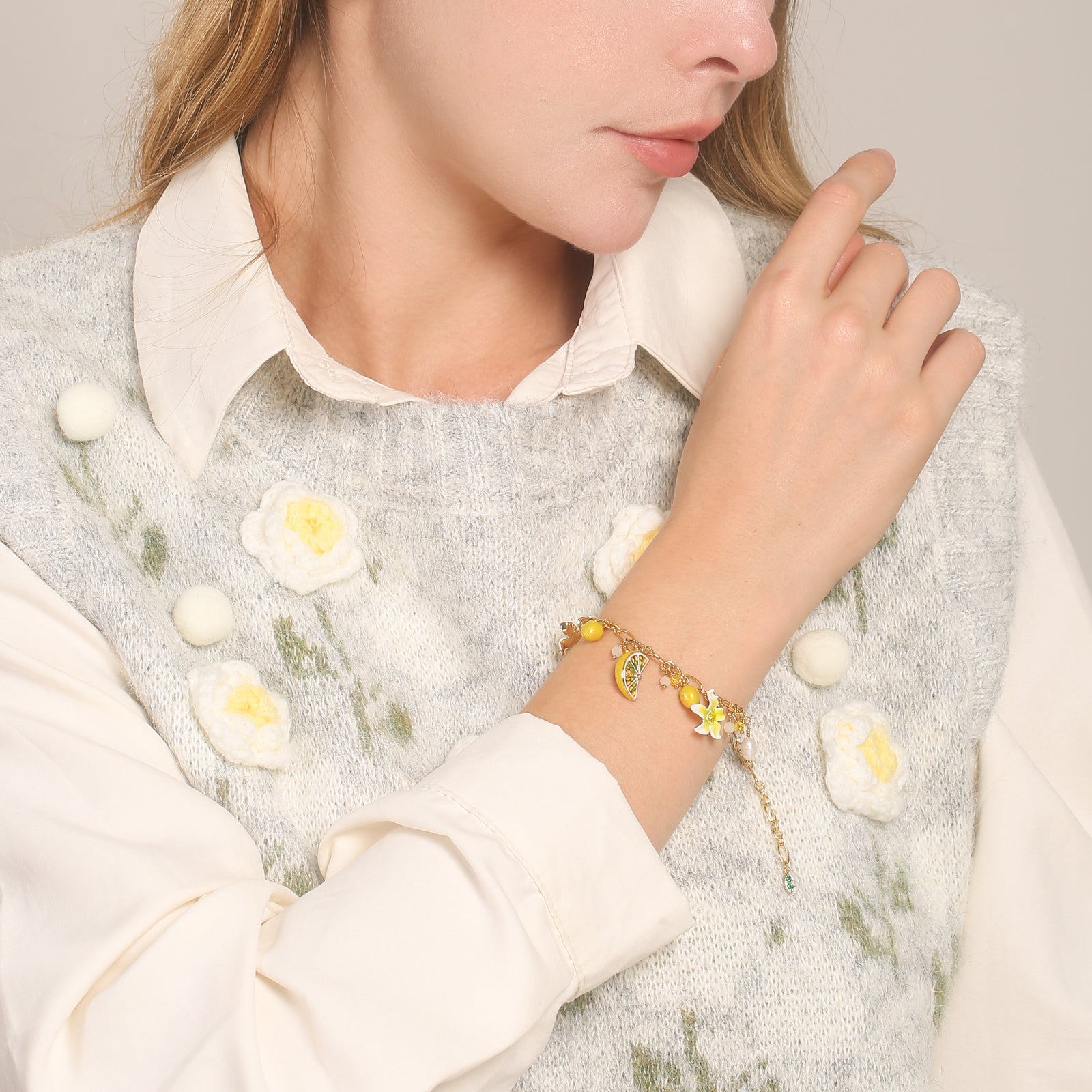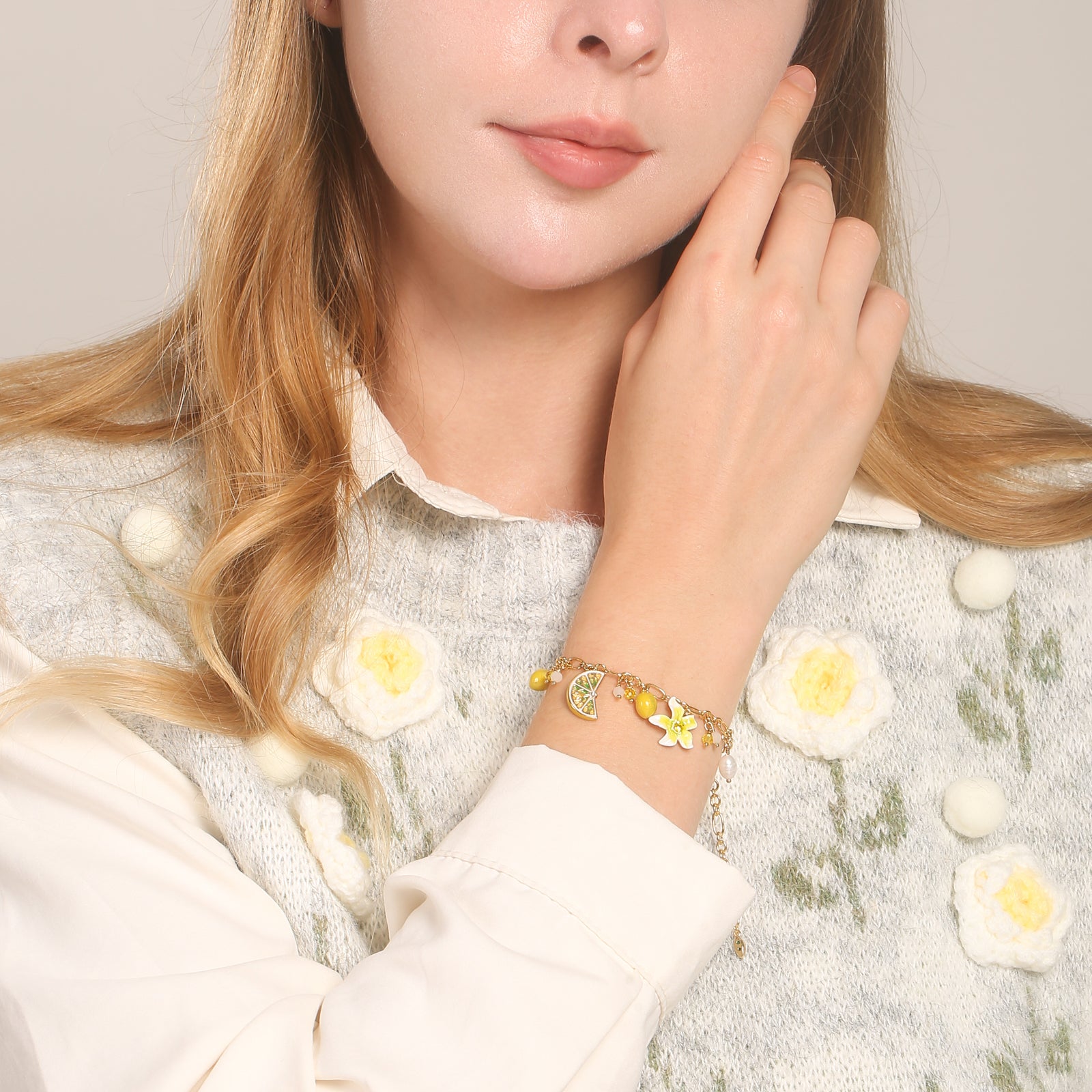 이 생생한 레몬 팔찌로 여름의 열등한 정신을 포용하십시오. 팔찌에는 활기 넘치는 에나멜 디테일과 빛나는 진주 악센트로 장식 된 장난스러운 레몬과 레몬 슬라이스 매력이 있습니다. 이 유쾌한 작품은 화창한 날과 열대 휴가의 본질을 포착하여 앙상블을 상쾌한 감귤 매력으로 주입합니다. 인생의 가장 달콤한 순간을 맛보고 과일 디자인이 여름 스타일에 신선도를 더해 주도록 알리는 알림으로 착용하십시오. 🍋✨